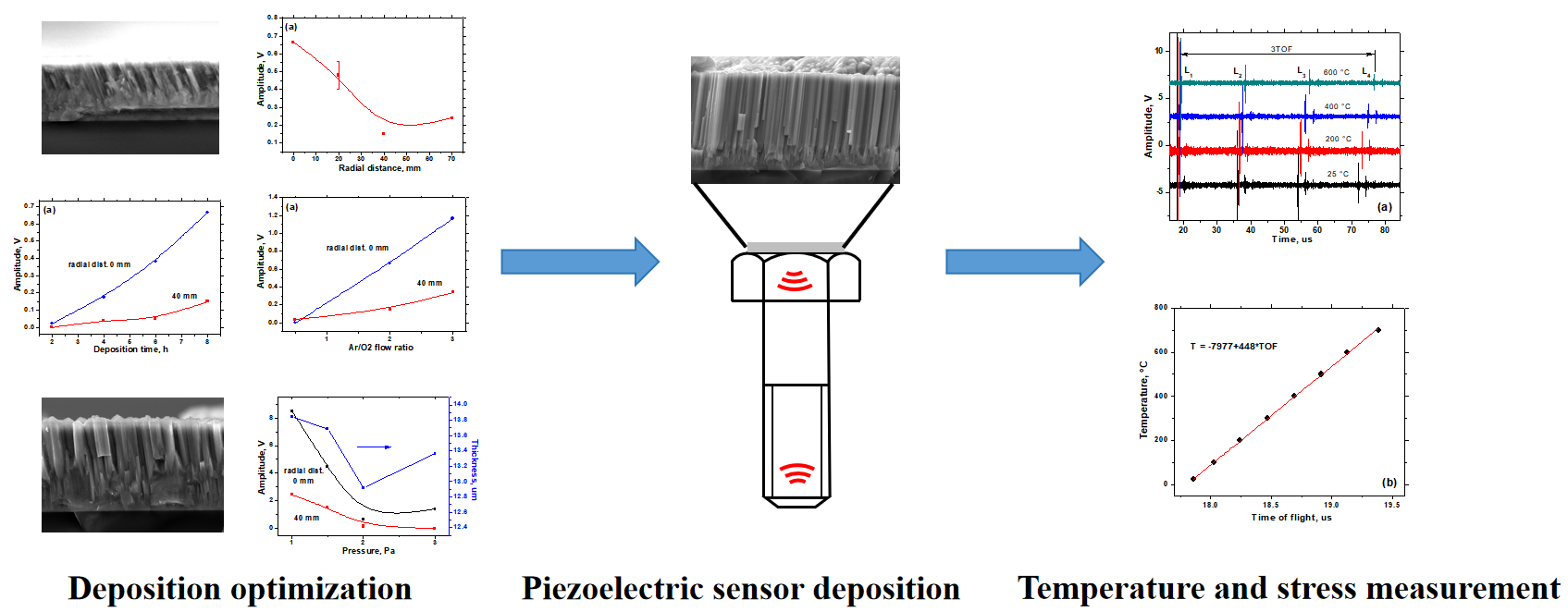 研究成果:立足核电、航空领域对高精度、在线、实时应力监测技术的需求,对压电薄膜传感器进行研究,分析影响传感性能的关键因素,致力于提升恶劣环境下传感器的稳定性及螺栓应力状态监测。已在合金钢、钛合金、不锈钢和高温合金等螺栓上制备ZnO、AlN、AlScN和LiNbO3等超声薄膜传感器,形成了原位温度监测及应力传感技术;开发了AlTiN-MoN、TiSiN、TiBN-CrN、WC-a-C:H、AlCrNbSiTaTiY、AlCrNbSiTaTi等硬质涂层和等高熵合金吸收涂层;设计开发了多套工业化物理气相沉积特种涂层制备设备及检测装备。所研发的智能螺栓传感器及系列智能螺栓产品,攻克了传感器的安装及标定技术难题,已在中国航空研究院、航天精工企业、湖南某增材制造设备厂家以及广核新能源应用。