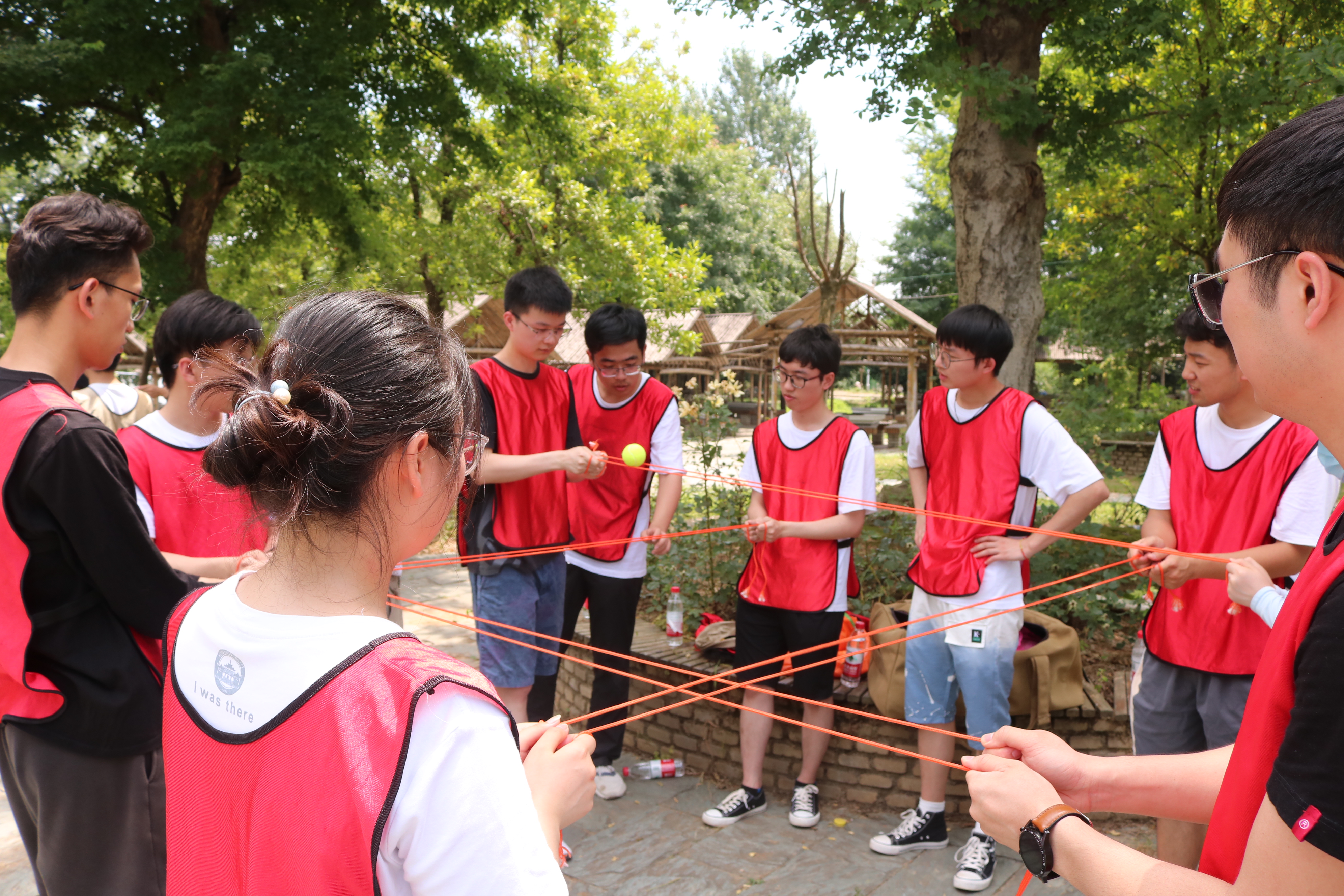接下来开始今天主要的两个素质拓展活动,都需要队员间的彼此配合。第一个活动“纵横天下”,八名队员通过八根尼龙绳控制网球走完一个方形。这需要队员间极强的默契与配合,争分夺秒练习之后开始了正式比赛。一队队员有些许紧张,出现了多次失误,第二次尝试时终于顺利完成,而二队队员发挥更稳定,一次通过,最终,二队以一秒的微弱时间优势获得了胜利。第二个活动“重走长征路”,队员们通过调整布面的倾斜来控制网球的行径方向,逐个停留在红军长征的地图的标志点上,从瑞金到延安,重走长征路。二队这次一鼓作气,队员间配合默契,指挥有度,以更大的优势获得了胜利。一队队员对于二队的发挥心服口服,集体接受了小惩罚。