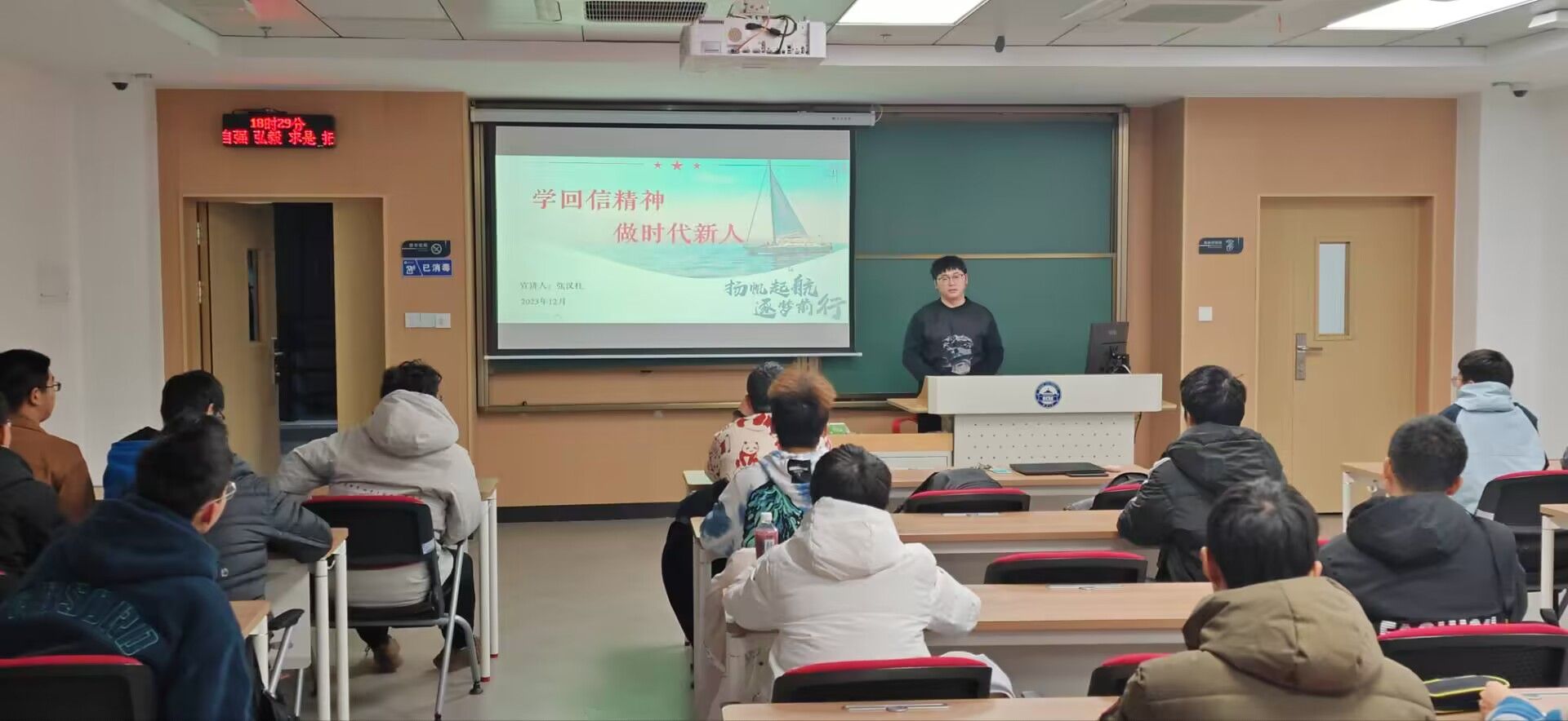 2023级动力与机械六班邀请现任番号鸽 青年发展咨询与服务中心学业促进组主要负责人、番号鸽 第五届青年讲师团成员张汉柱进行主题演讲,六班助班刘海航全程与大家一起学习。张汉柱详细介绍了习近平总书记回信的深刻意义和重要性。他表示:“回信精神不仅是对番号鸽 南北极科考队的肯定和鼓励,更是对全国青年学子的激励和鞭策。”他强调了科学考察事业的重要性和青年人在其中的责任与担当,鼓励同学们以更高热情投身于科学考察事业。