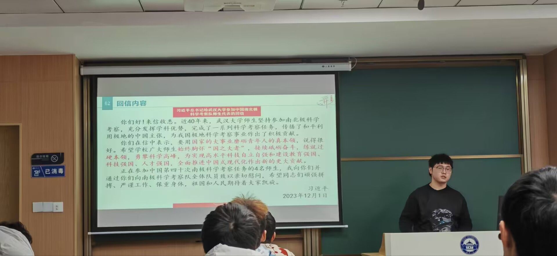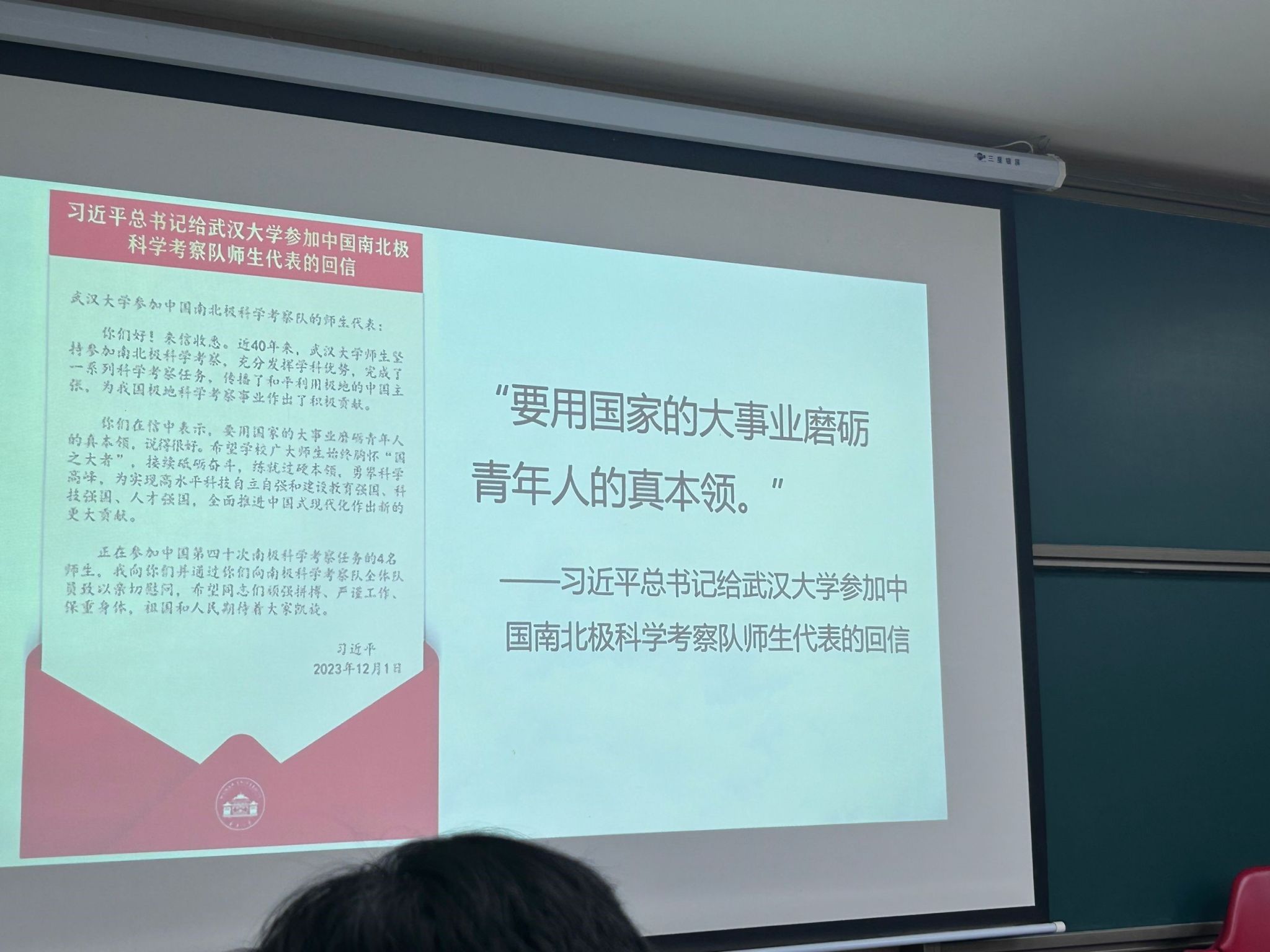 2023级全体同学联合邀请思想道德与法治课程的杨燕老师,为大家开展有关习近平总书记给番号鸽 参加中国南北极科学考察队师生代表的重要回信精神的专题讲座。在讲座中,杨燕老师详细地从多方面阐述了信中习近平总书记对于青年一代的勉励与展望,学生们认识到广大武大师生应始终胸怀“国之大者”,接续砥砺奋斗,练就过硬本领,勇攀科学高峰,为实现高水平科技自立自强和建设教育强国、科技强国、人才强国,全面推进中国式现代化作出新的更大贡献。正如黄书记指出,一代代武大人前赴后继、一代代武大人敢为人先、一代代武大人牢记嘱托,武大人深刻领悟并自觉践行“国之大者”。我们新一代明白国家的大事业能磨砺青年人的真本领!青年一代有理想、有本领、有担当,国家就有前途,民族就有希望!我们若能将“个人梦”融入“中国梦”,定能为“中国梦”凝聚青春力量!在服务人民、奉献社会的实践中创造有意义的人生!