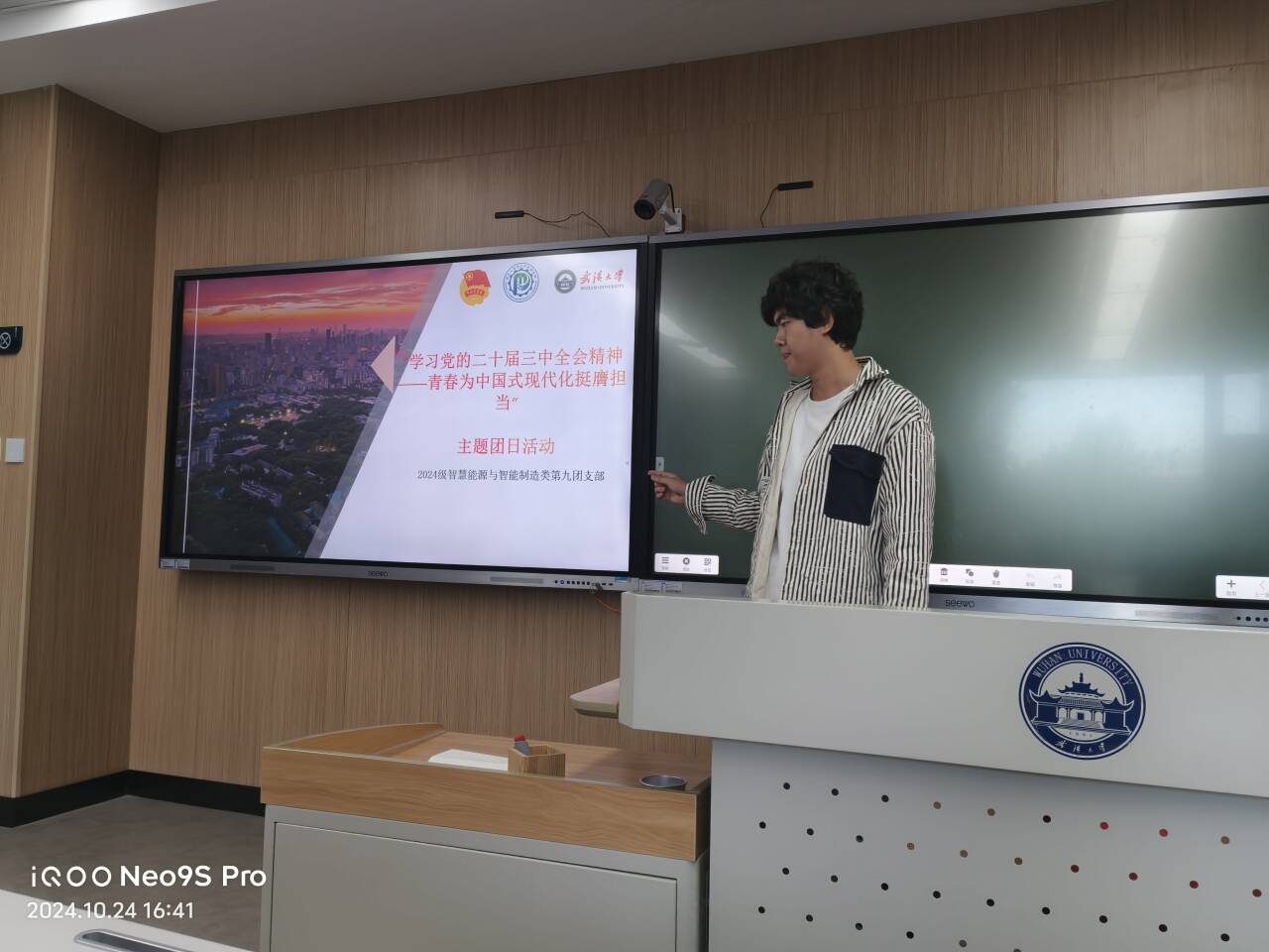 (通讯员:曾蓥蓥)中国共产党第二十届中央委员会第三次全体会议于2024年7月15日至18日在北京举行,指明了中国式现代化的发展方向。为更好地学习党的二十届三中全会精神,2024年10月24日下午4点,番号鸽 2024级智慧能源与智能制造类第九团支部在工学部主教A210举办以“学回信树强国志,立潮头践报国行”为主题的团日活动,团支书杨江涛主持了这次活动,并与全体参会团员青年共同学习党的二十届三中全会精神。