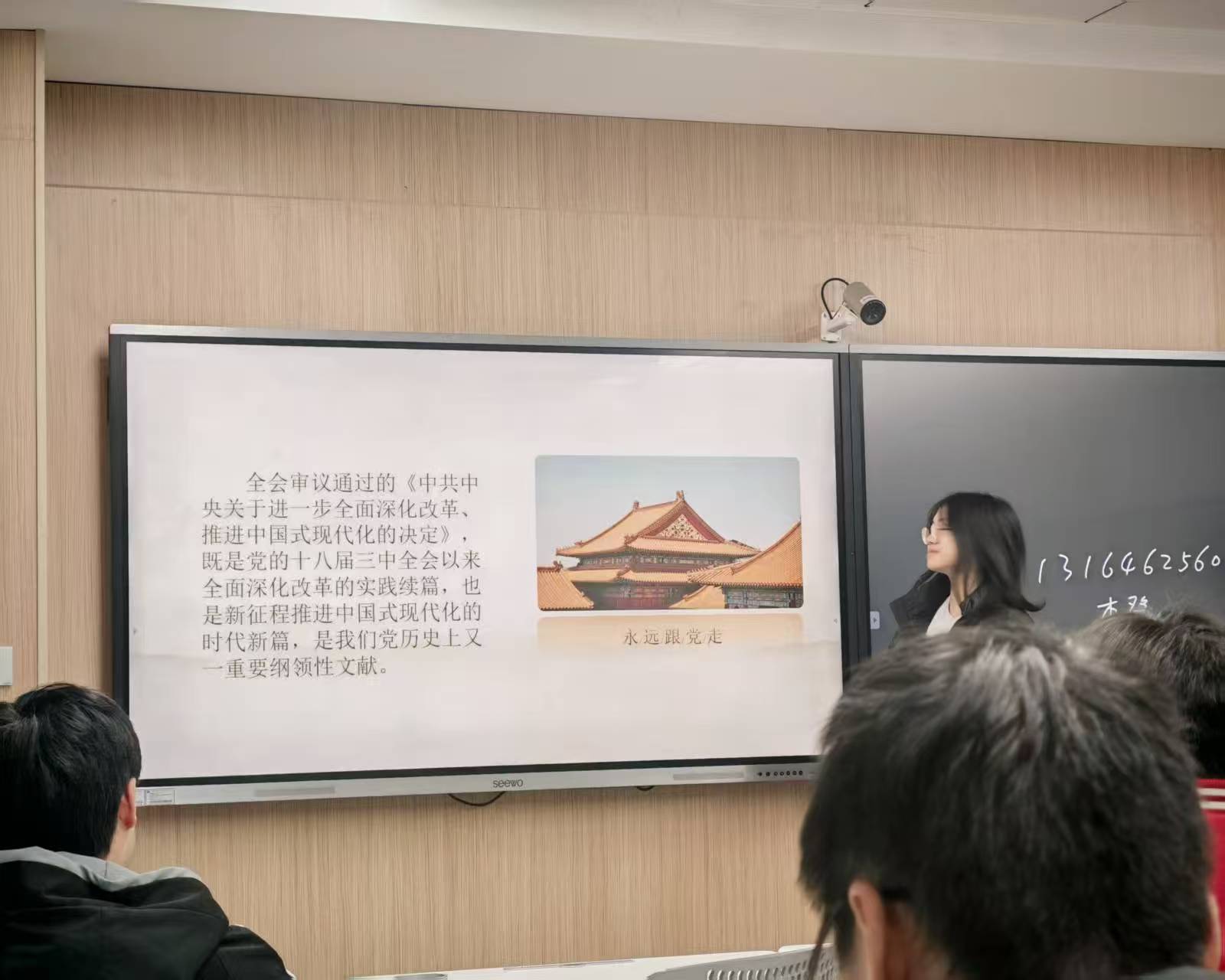 在活动中,团支书陈泓冰通过精心制作的PPT展示和深入浅出的案例分析,对党的二十届三中全会的背景、意义和主要内容进行了详细解读。她从全会召开的时代背景切入,阐述了中国共产党在新时代新征程上坚定不移高举改革开放旗帜、推进中国式现代化的战略决策。使团员青年们对全会精神有了更直观认识。随后,团员青年们被分成若干小组,围绕“如何在日常学习和生活中践行全会精神”这一主题展开热烈讨论。各小组成员积极发言,结合自身专业特点和未来规划,探讨了在科技创新、社会实践、志愿服务等方面的具体行动路径。讨论结束后,各小组推选代表进行了精彩发言,分享了小组讨论的成果和共识。一位同学代表表示:“通过讨论,我们深刻认识到作为工科学生,应在科技创新领域勇挑重担,为实现科技强国梦贡献自己的智慧和力量。”