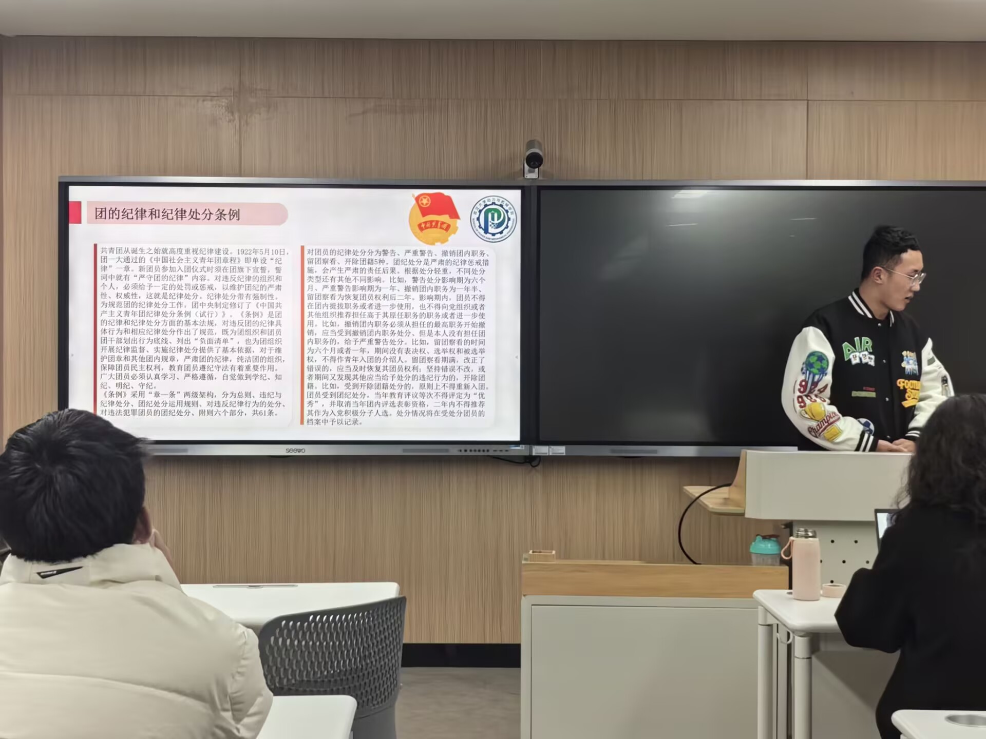 最后何奥朗播放相关视频,让团员青年们深入了解团的纪律和处分条例。视频以生动案例、清晰讲解,展示团内纪律的具体要求,以及违反纪律的后果和对应处分。团员青年们聚精会神,被丰富的内容吸引,时而认真记录,时而低声交流。视频结束后,团支书组织讨论,团员们踊跃发言,分享感受。