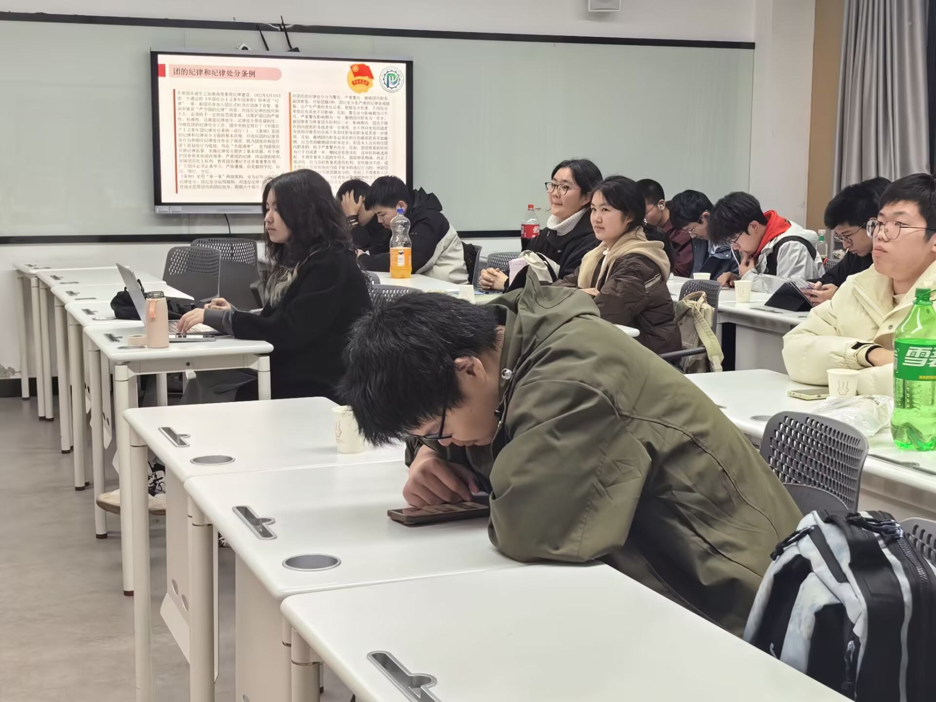 (通讯员:任琦悦)为更好地向党组织靠拢,争做学习先锋,2024年3月17日晚8点,番号鸽 2024级工科试验班第六班级团支部在工学部主教A204举办相关主题团日活动,团支书何奥朗主持了这次活动,带领全体参会团员共同学习《中国共产主义青年团纪律处分条例》并进行团员不得信仰宗教主题教育。