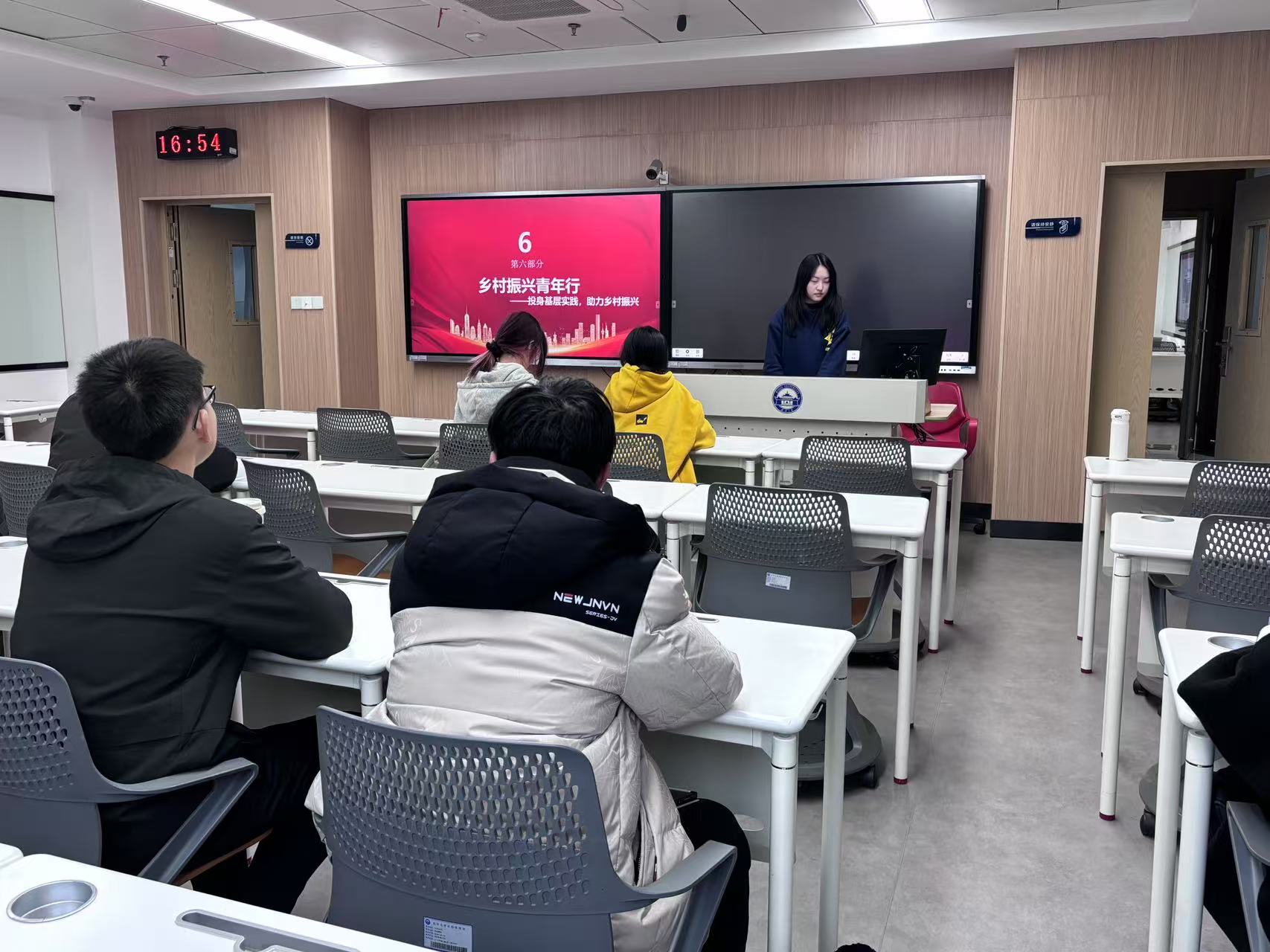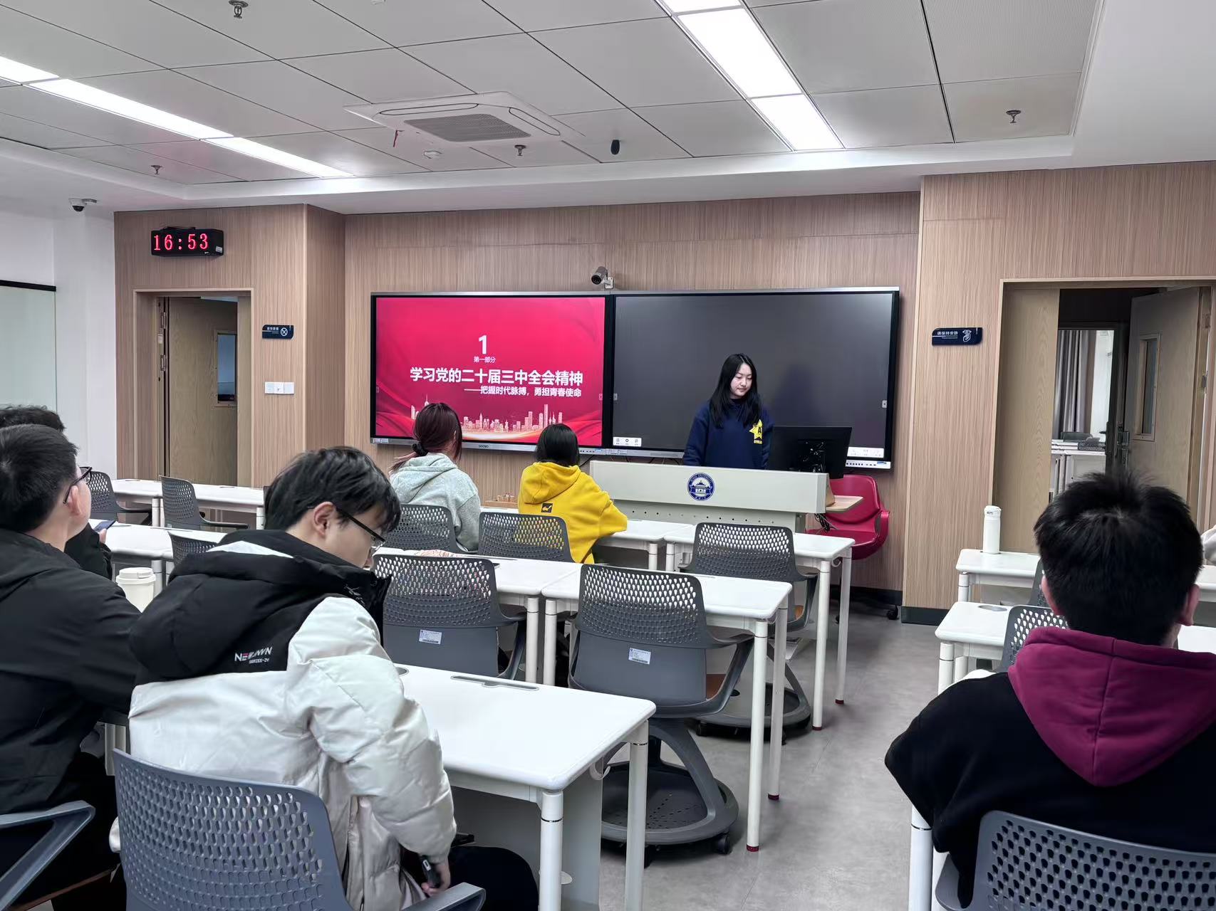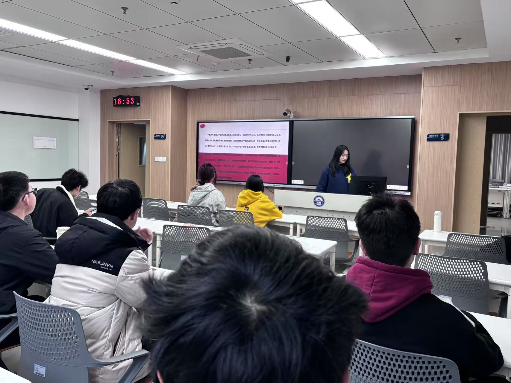 第一个主题为“深入学习党的二十届三中全会精神”。为了更好地理解和吸收全会的核心内容,团员青年们采取了多种学习方式,包括专题讲座、小组讨论等。团支书熊欣瑶主持了专题讲座环节,她不仅详细地解读了全会精神的深层含义,还拓展了其外延,帮助团员们全面把握全会的指导思想。小组讨论环节则为团员们提供了一个自由交流的平台,他们积极发言,将全会精神与个人的实际情况相结合,探讨了如何将这些政策和思想转化为具体的行动。