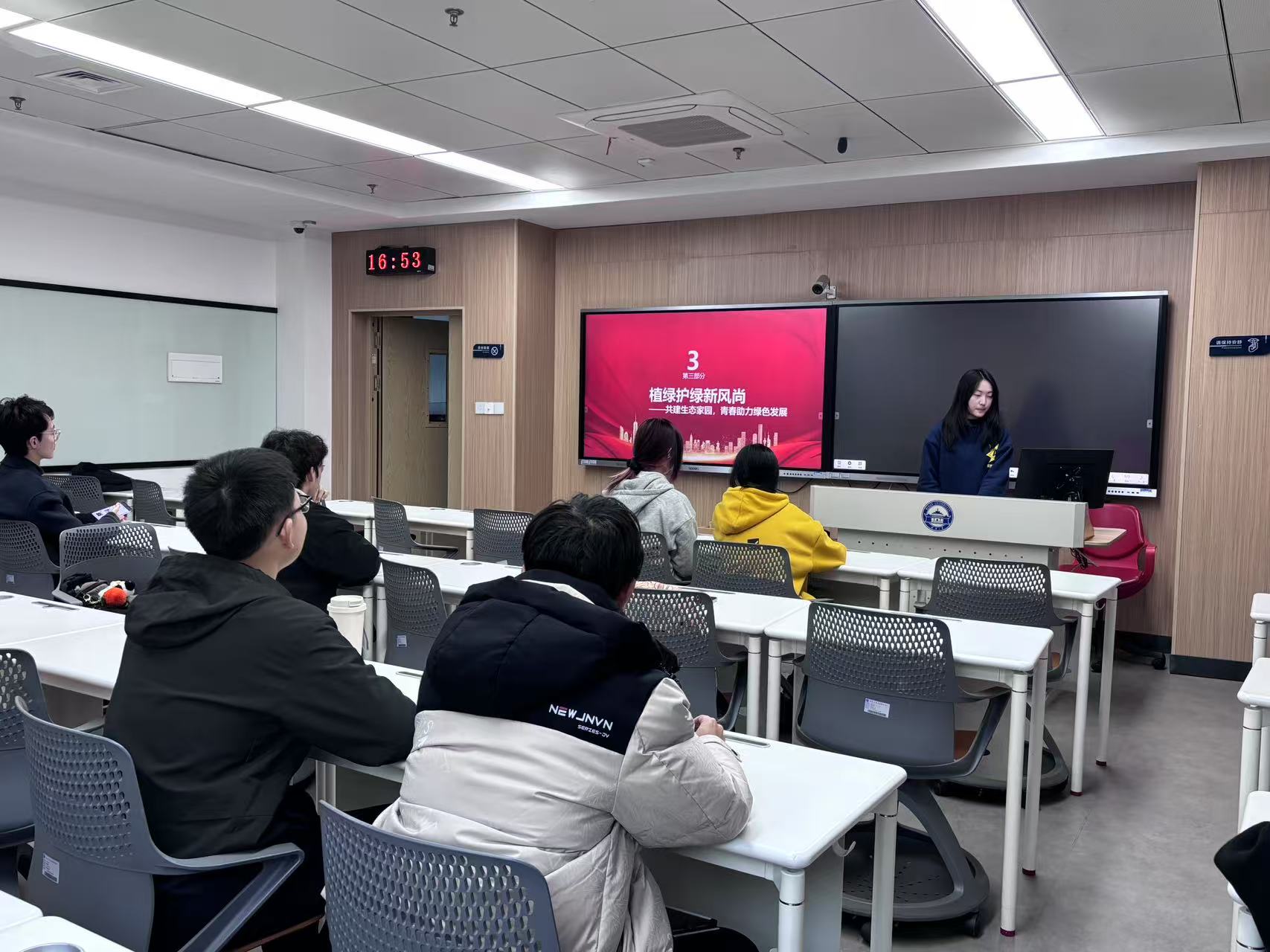 第三个主题为“植绿护绿新风尚”。熊欣瑶为团员们讲起了“绿色发展”,她通过"微课堂"阐释绿色发展深意:"一株绿植年均固碳4公斤,一间教室的绿萝墙能净化30%空气,点滴行动都在为地球‘减负’。"这些科学数据让团员青年们直观感受到生态文明建设不仅是国家战略,更是青春责任。为了将生态文明理念融入青春实践,团支部同步发起“21天绿色生活打卡”,鼓励团员们记录节水节电、垃圾分类等绿色行动。