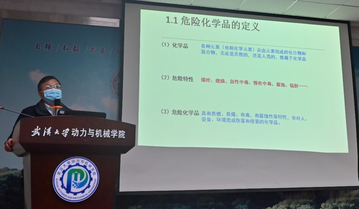 会议伊始,谢学军进行了“化学品安全与环保”实验室安全教育讲座。谢学军在讲座中由浅入深,从专业的角度向大家介绍了危险化学品的定义、特性以及分类,带领大家认识了危险化学品标识、安全标签、安全技术说明书等,重点讲解了危险化学品的废弃处理措施、防护措施以及紧急处理措施。谢学军强调,各个实验室要加强化学品管理,在进行化学品实验时一定要注重实验安全,要做好处理尾气等实验收尾工作,防止对自身及周围同学的生命安全造成危害。
