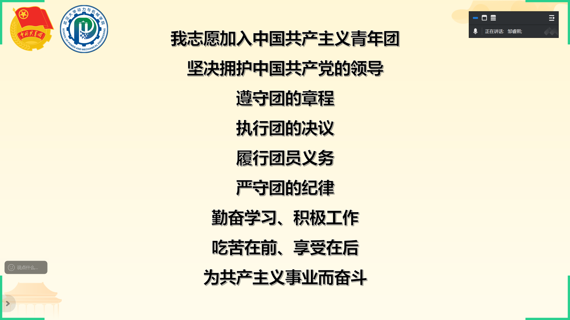 最后,活动以重温入团誓词的方式圆满落幕。团员青年们庄严地举起右手,齐声宣读入团誓词。这一句句誓言,不仅是团员青年对自身政治身份的深刻铭记,更是他们向党、向人民作出的庄严承诺,深刻彰显出他们对党的无限忠诚与赤胆忠心,和对人民的深情厚谊与无私热爱。字字铿锵,句句有力,充分展现出新时代团员青年勇挑时代重担的责任意识,以及坚定不移跟党走、为实现中华民族伟大复兴而不懈奋斗的崇高理想信念。