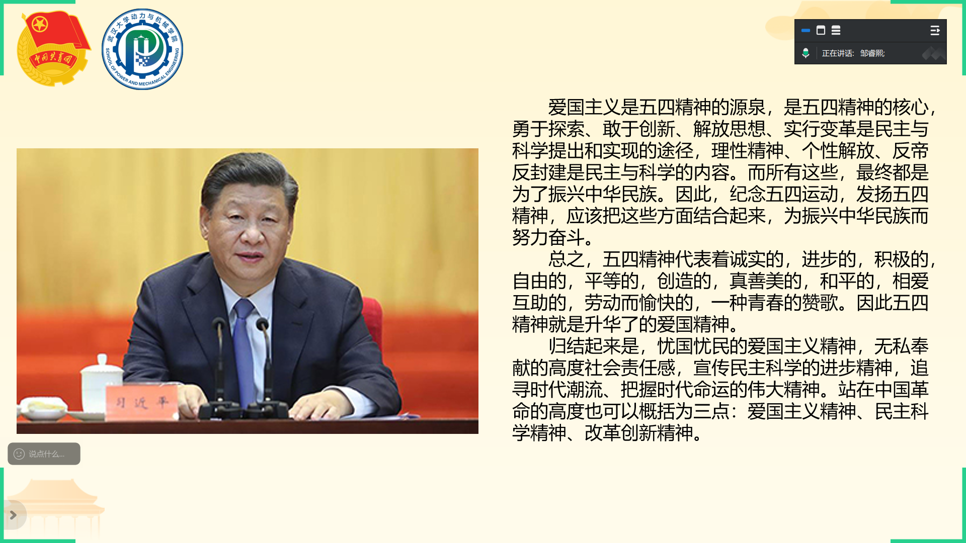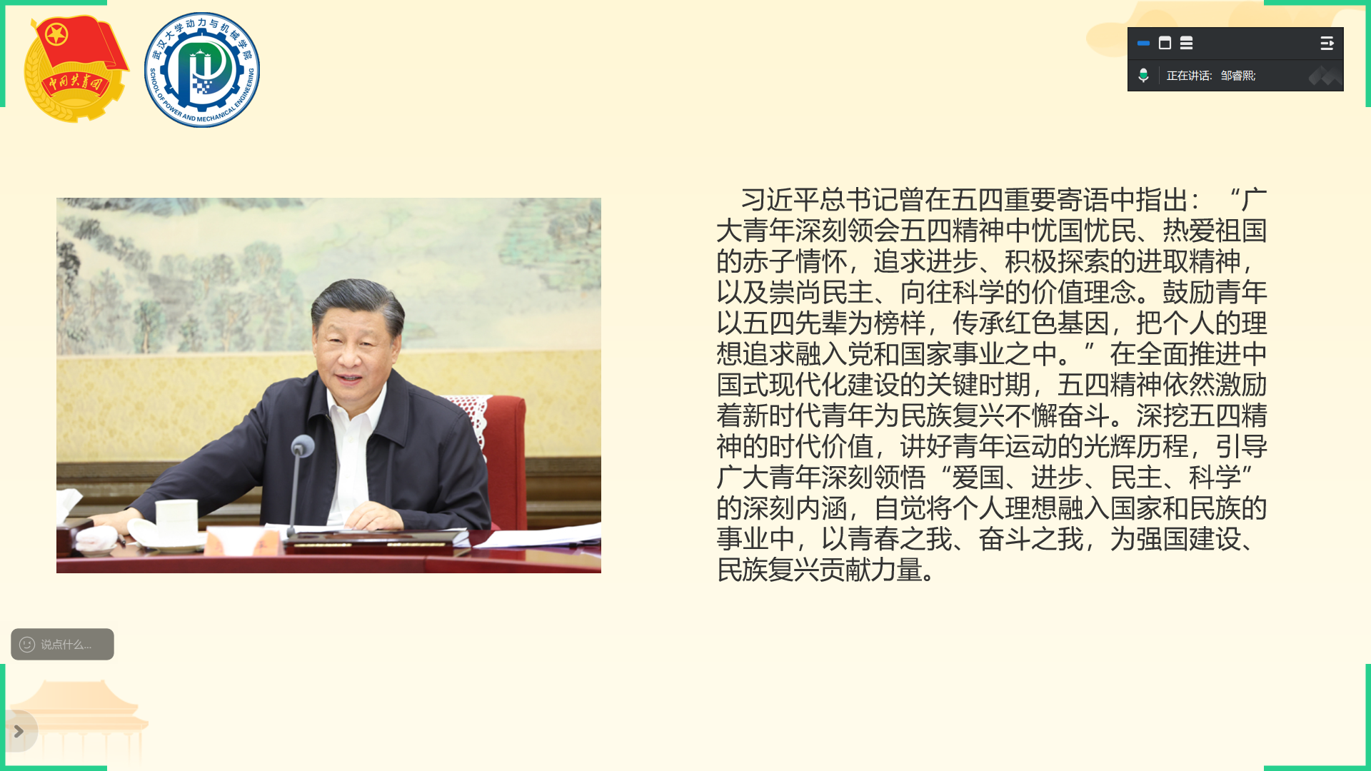 紧接着,团支书邹睿熙担任主讲人,为大家深入阐释五四精神的内涵与时代价值。邹睿熙准备充分,通过一个个生动鲜活的案例,如五四运动中,青年学生为捍卫国家主权和民族尊严,毅然走上街头,面对反动势力毫无惧色;还有众多先驱为传播新思想、新文化而不懈奋斗,他们的感人故事让全体成员仿佛置身于那个波澜壮阔的历史场景。为增强在场团员青年们的直观感受,邹睿熙还精心挑选相关视频。视频中呈现的历史画面让他们沉浸其中,在场团员青年无一不对先辈们的崇高精神感到深深的震撼,从而更真切、更深刻地领略到五四精神的伟大与崇高。