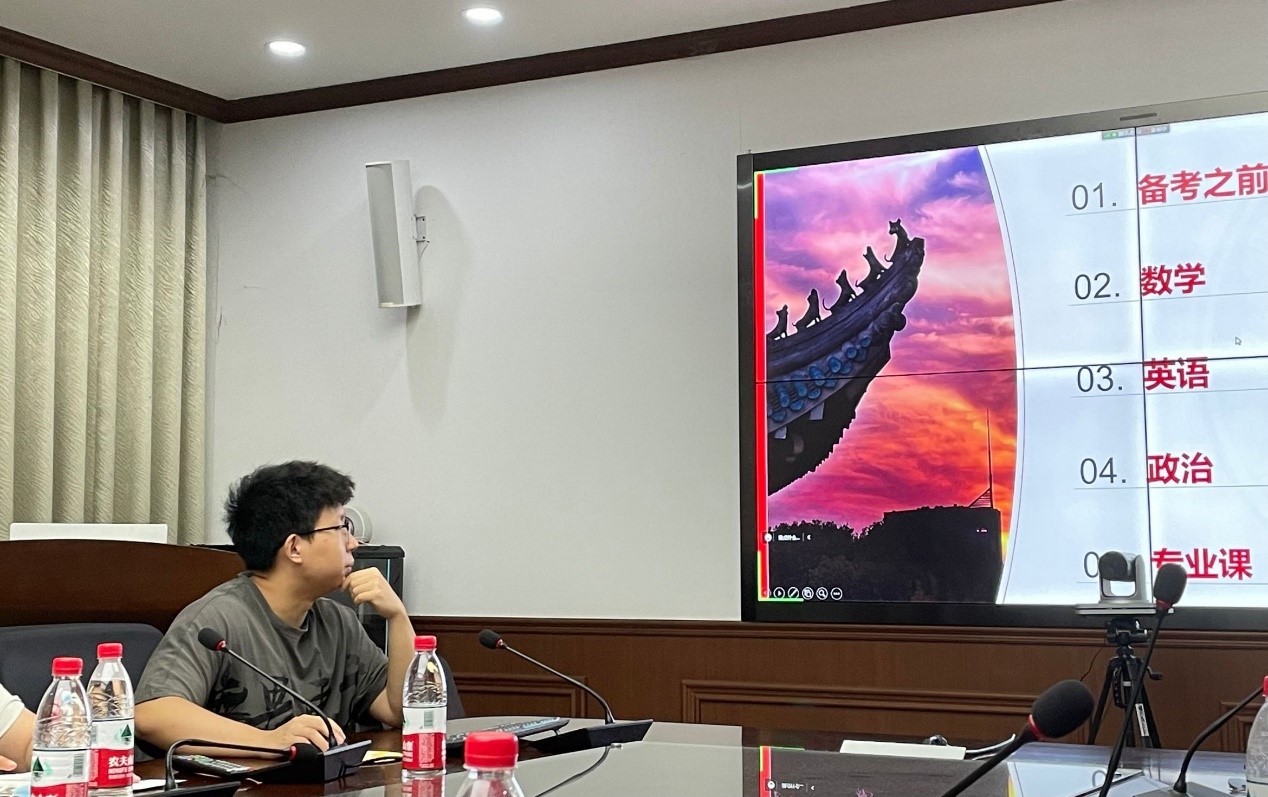 同样分享考研经历的还有来自清华大学深圳国际研究生院的雷睿其学长。他向同学们重点分享了考研各科复习方法,他提到数学的第一轮复习很重要,考研英语要不间断背单词和刷题,建议同学们每周进行三道四次英语作文模板的学习记忆,对于专业课要及时找好资料,吃透难点重点,雷睿其学长分享道政治复习不要过早开始,可以看看课程做做试卷。同时,学长建议大家要劳逸结合、保证睡眠。最后向同学们表达了祝愿。