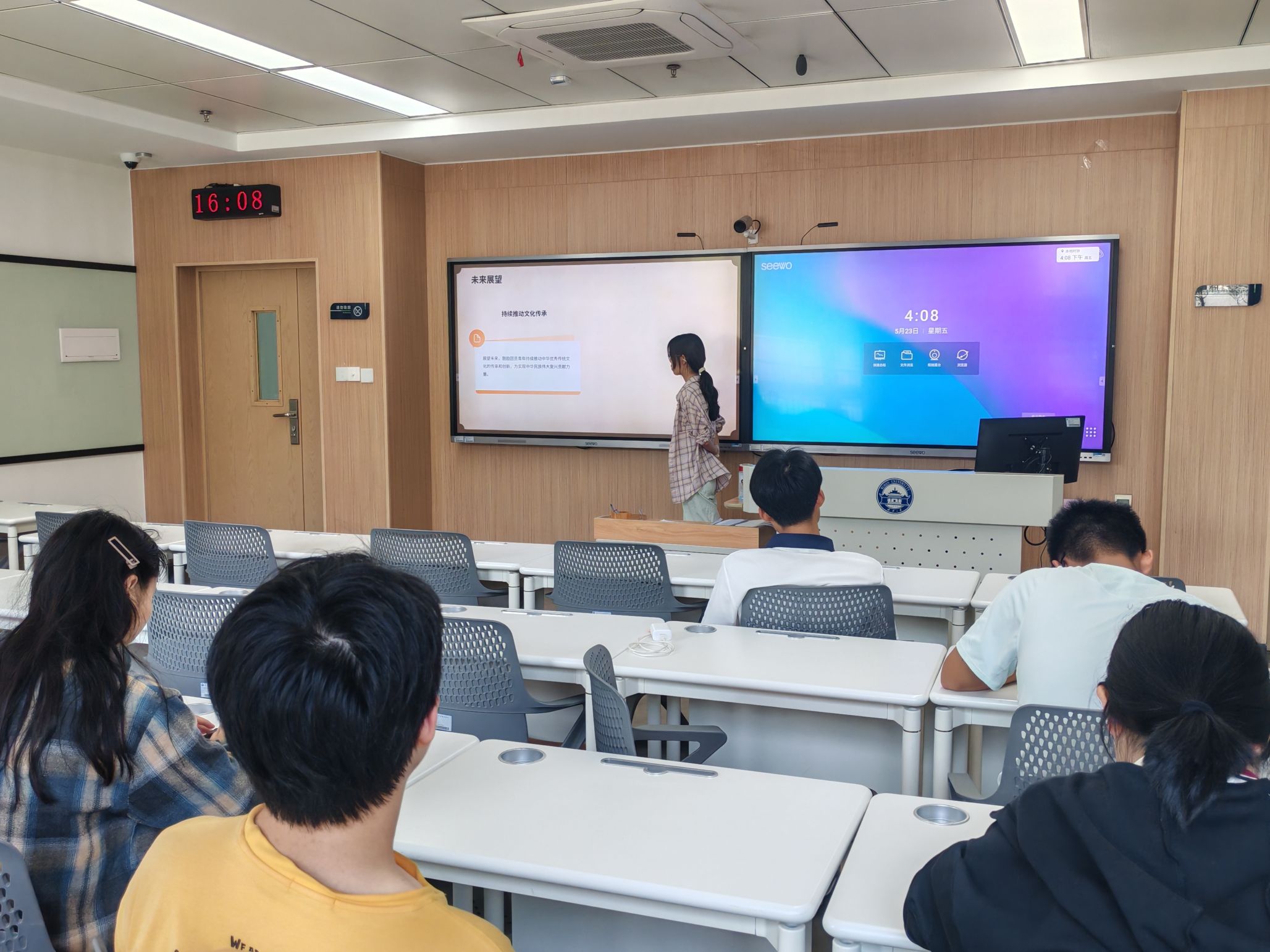 在活动的第二部分,组织委员黄悦以“文化自信铸灵魂——传承中华优秀传统文化,弘扬时代新风”为主题进行讲解。她首先强调了优秀传统文化的重要性,指出中华优秀传统文化是中华文明的智慧结晶,是中华民族的根和魂,是中国文化在世界文化激荡中站稳脚跟的根基。文化自信是中华民族伟大复兴的重要精神力量,传承和弘扬中华优秀传统文化能够增强民族自豪感和文化认同感并为时代新风提供精神支撑。同时,她指出传承不是简单的复刻,而是要在创造性转化中赋予传统文化新的时代内涵,在创新性发展中为弘扬时代新风注入精神源泉,让传统文化真正成为滋养民族心灵、引领社会风尚的不竭动力。