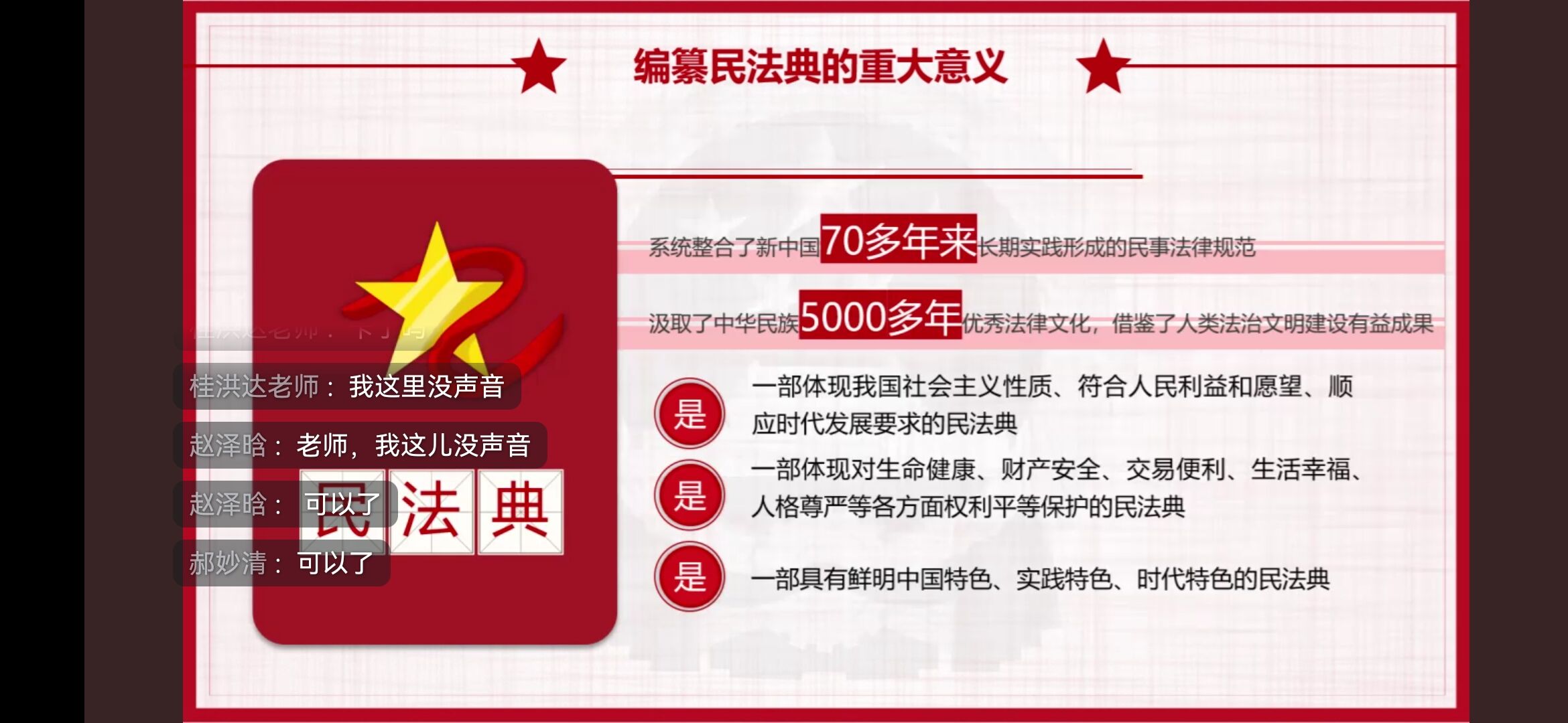 民法典实施至今已接近两年,或许很多同学仅闻其名,却不知其“实”。对此,支教队特别设置了一堂民法典普法讲座,并根据各年龄段学生的特点进行授课。