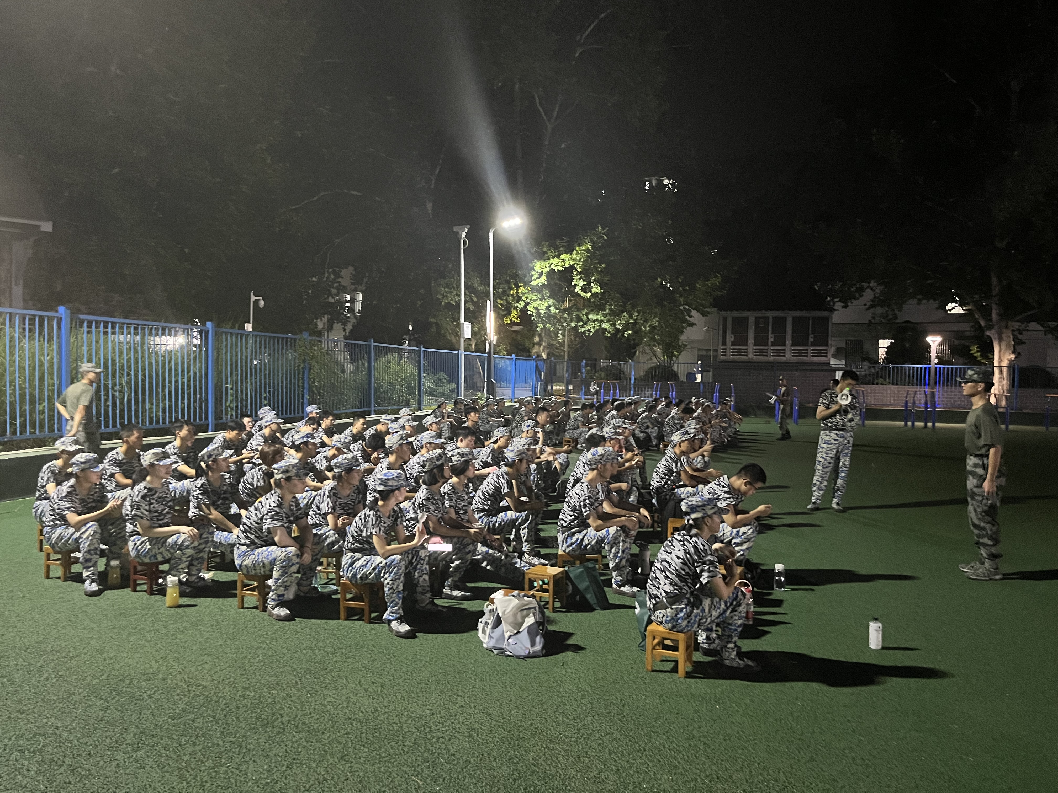 路边微黄的路灯照映着珞珈山的夏夜,山下的学子正在绿茵上放声高喊,展现军人应有的雄姿英发。晚风拂过,军歌起落,高昂混雄的歌声飘扬在充斥着盛夏的余热的天空中。铁骨铮铮,热血腾腾,站军姿时的汗水浸透了每个人的衣衫,挂在衣领上的汗水反射灯光,照在彼此脸上,我们嘴角微扬,那是武大的少年郎不畏考验的标志。
