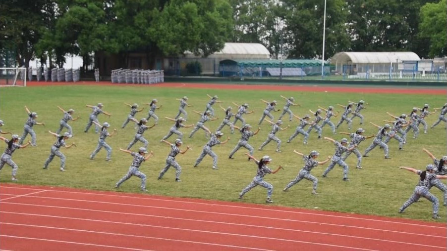 首先,接受检阅的是捕俘拳与匕首操方阵。伴随着振奋的音乐,学生们闻令而动,仿佛化身成训练场上最英勇果敢的战士。青春担当,舍我其谁。他们在场上的一招一式、一动一静,尽显军人本色。