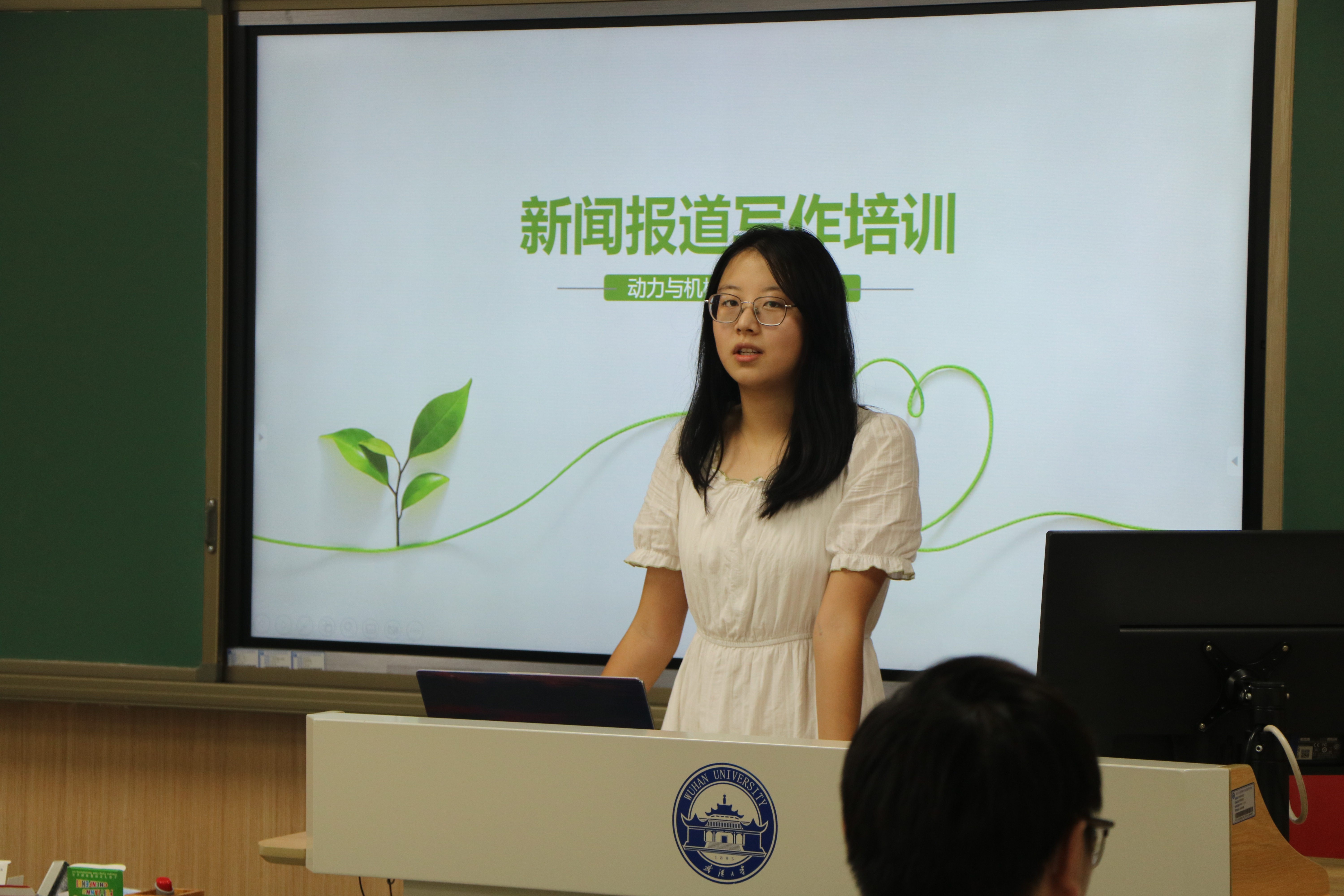 王嘉为参会的宣传委员讲解了新闻稿写作的基本要求。在她有条不紊的讲述中,大家了解了新闻稿的构成、格式、语言和基本写作的注意事项。她指出撰写新闻稿的基本要求,举出不同的语法、用词、句式、格式、标点等方面的错误,让大家直观感受到了新闻稿严谨精炼的特点。她还强调了新闻的时效性,鼓励大家能够提高出稿效率。校园新闻让信息及时传播,新闻稿的作者也担任着至关重要的使命。