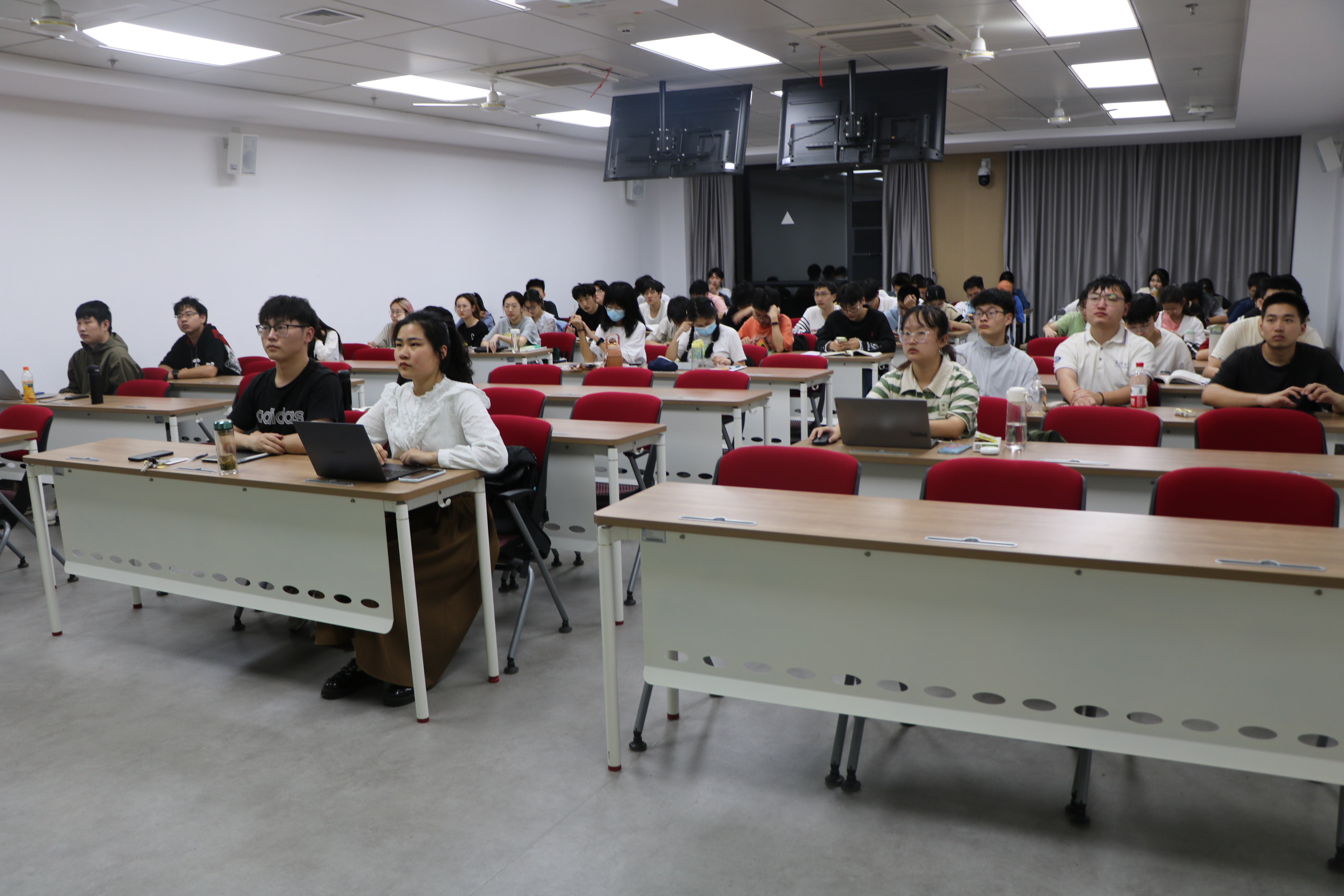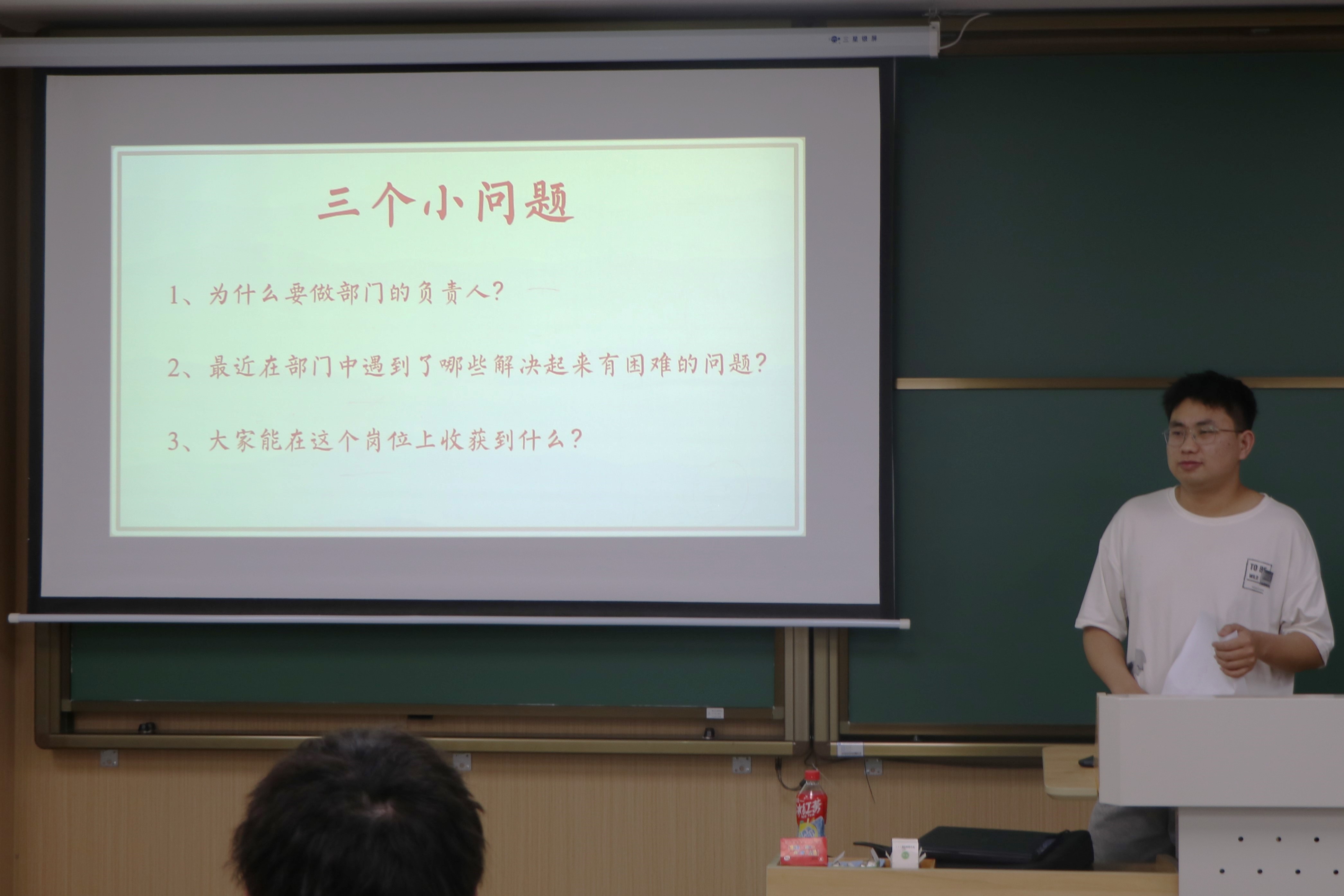 活动开始,王鑫首先提出了三个问题:为什么要做部门负责人、最近在部门中遇到了哪些难以解决的问题以及大家在自己的工作岗位中学到了什么。曾芮和林可等同学积极地分享了自己的感受。曾芮从制作PPT的能力、与同学老师的交流以及心态上的进步三个方面表达了自己的收获,林可表示如何更好地协调学生工作与个人学习生活是她最近遇到的难题。针对上述同学的回答,王鑫进行了简单总结,同时根据自己的亲身经历,向大家讲述了在学生工作的同时所收获的成果,比如社交能力的提高、专业学习资料的获取以及科研经验的积累。与此同时,王鑫也分享了四点工作的小建议:不抱怨、不求全责备、多进行共同交流以及认真学习。