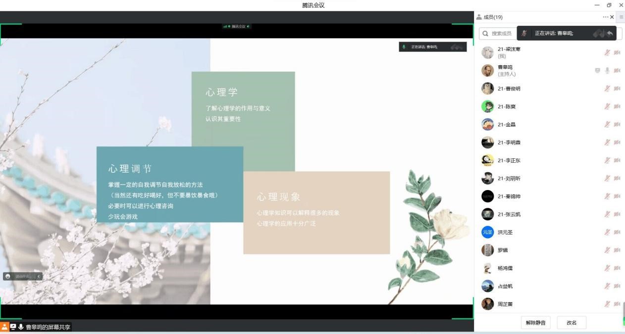 由于疫情影响,一部分班级选择在寒假期间以线上的形式开展心理班会,为不能见面的同学们提供了一次交流的机会。无论形式如何,各班举办的心理班会均达到了增加同学们心理健康知识,缓解生活学习压力,促进同学间交流的预期效果。