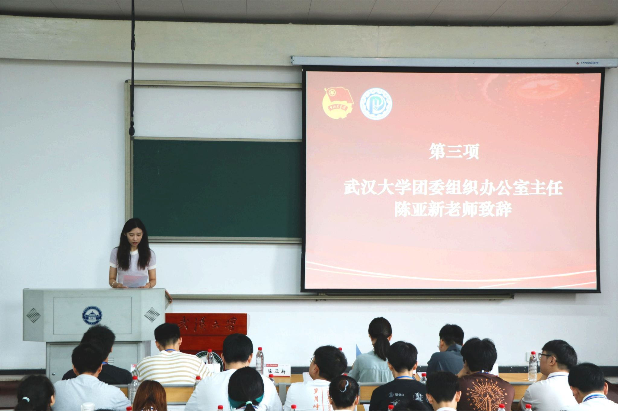 接着,校团委组织办公室主任陈亚新致辞。她对院团委过去三年的工作成果给予了充分的肯定。她与学院的团员青年们分享了三点感想:第一,必须把牢政治方向,进一步凝聚广大青年学生听党话跟党走;第二,必须提高改革攻坚能力,进一步增强团学组织力战斗力;第三,必须坚持从严治团,进一步塑造团学组织清新形象。她呼吁与会的团员青年们立足新时代新征程,踔厉奋发,笃行不怠,为国家富强、民族振兴和人民幸福的伟大事业贡献更多的武大青春力量。