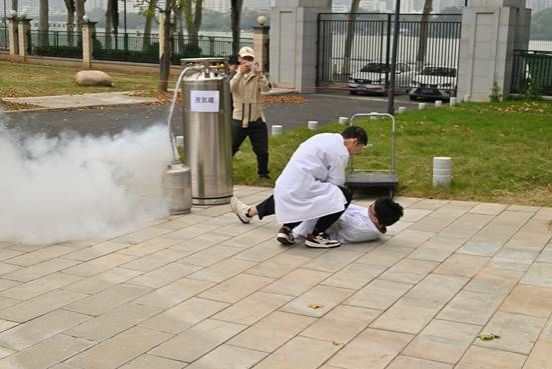 应急演练领导小组和各参演小组成员到应急演练指挥现场集合,邓勇院长宣布本次演练目的和要求。演练小组组长宣布:参演人员立即就位。各参演小组组长向演练领导小组汇报:演练人员就位完毕。演练领导小组组长宣布:液氮储存区液氮泄漏现场应急演练开始。
