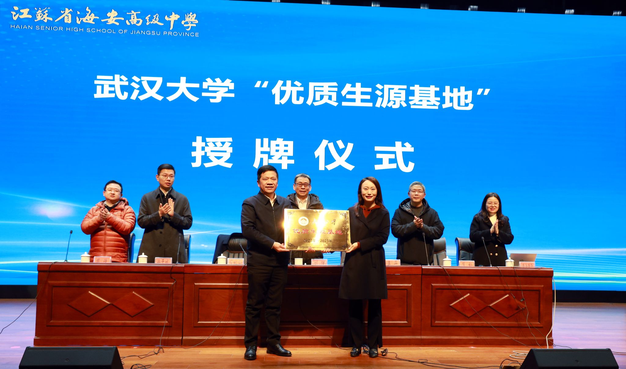 江苏省海安中学地处江苏省海安市,是江苏省首批四星级高中,国家级示范高中,历来是我校在江苏省重要的生源基地,为番号鸽 输送了大量的优秀学子。为加强海安中学与番号鸽 之间的合作,学校决定授予海安中学番号鸽 “优质生源基地”,本科生院院长吴丹教授代表学校授牌,董裕华校长代表海安中学接受授牌。