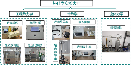 401热科学实验大厅主要服务于传热学、工程热力学和流体力学等专业课程,实验大厅配备了多种新型实验设备20余台套,包括多种传热实验模块、膜态沸腾、超临界相态、蒸汽轮机发电和喷管特性实验台等。这些设备不仅为学生提供了前沿的实验技术支持,还大大丰富了实验教学内容,帮助学生更直观地理解课程中的核心理论、深入掌握课程中的关键知识点。