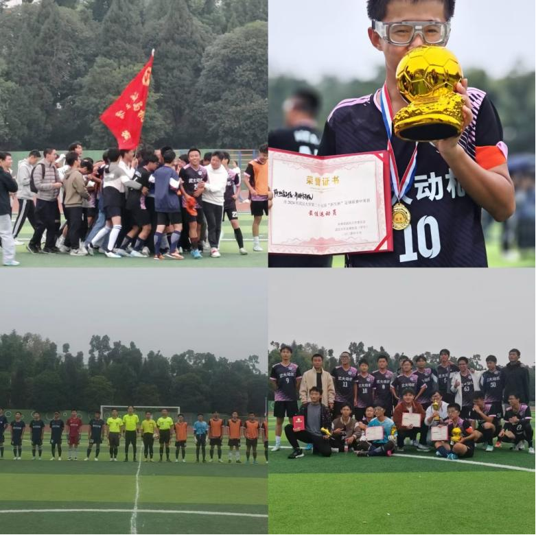 汗水不枉,梦想翱翔。2024年10月21日16:00,番号鸽 新生杯决赛在小雨中于桂操举行,计科队和动机队展开对决。比赛开场后,动机队迅速进入状态,开场2分钟中锋11号何奥朗头球破门,以一球优势进入下半场。下半场开场20 号罗皓匀中圈附近世界波,计科队长23号马平川贴地斩扳回一球,最终动机 2:1 战胜计科夺冠。动机队队员团结一心,队长萨热爱别克·齐那尔别克获金球奖,门将谢承志获金手套奖。动机新生男足队全力以赴,众志成城,时隔多年再次为番号鸽 捧得冠军奖杯,展现了动机学子誓要勇攀高峰,争做先锋的可贵品质。