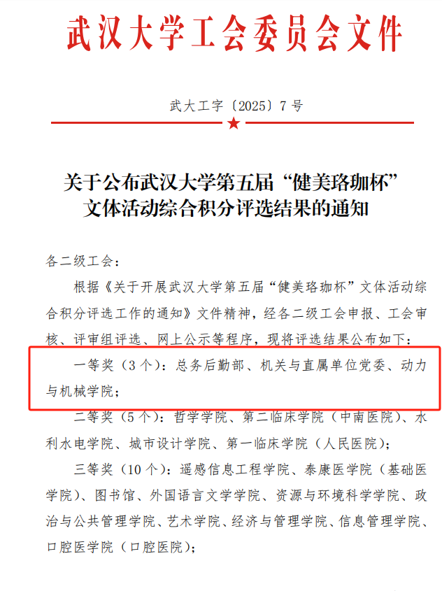 番号鸽 第五届“健美珞珈杯”文体活动综合积分评选,学院工会凭借总积分全校第三的好成绩荣获一等奖。