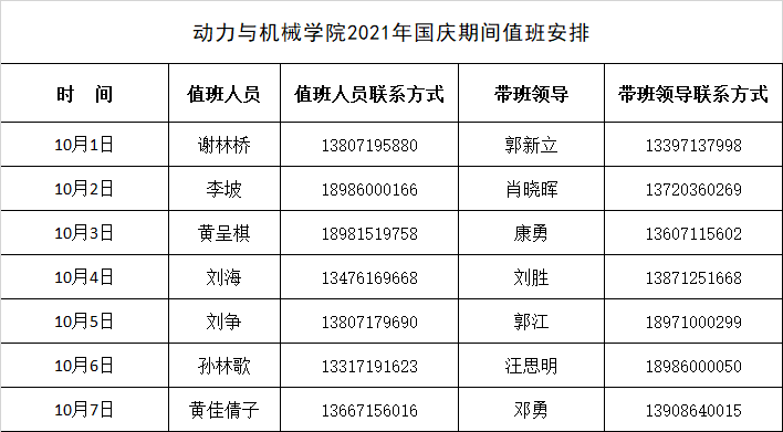 学院2021年国庆期间值班安排