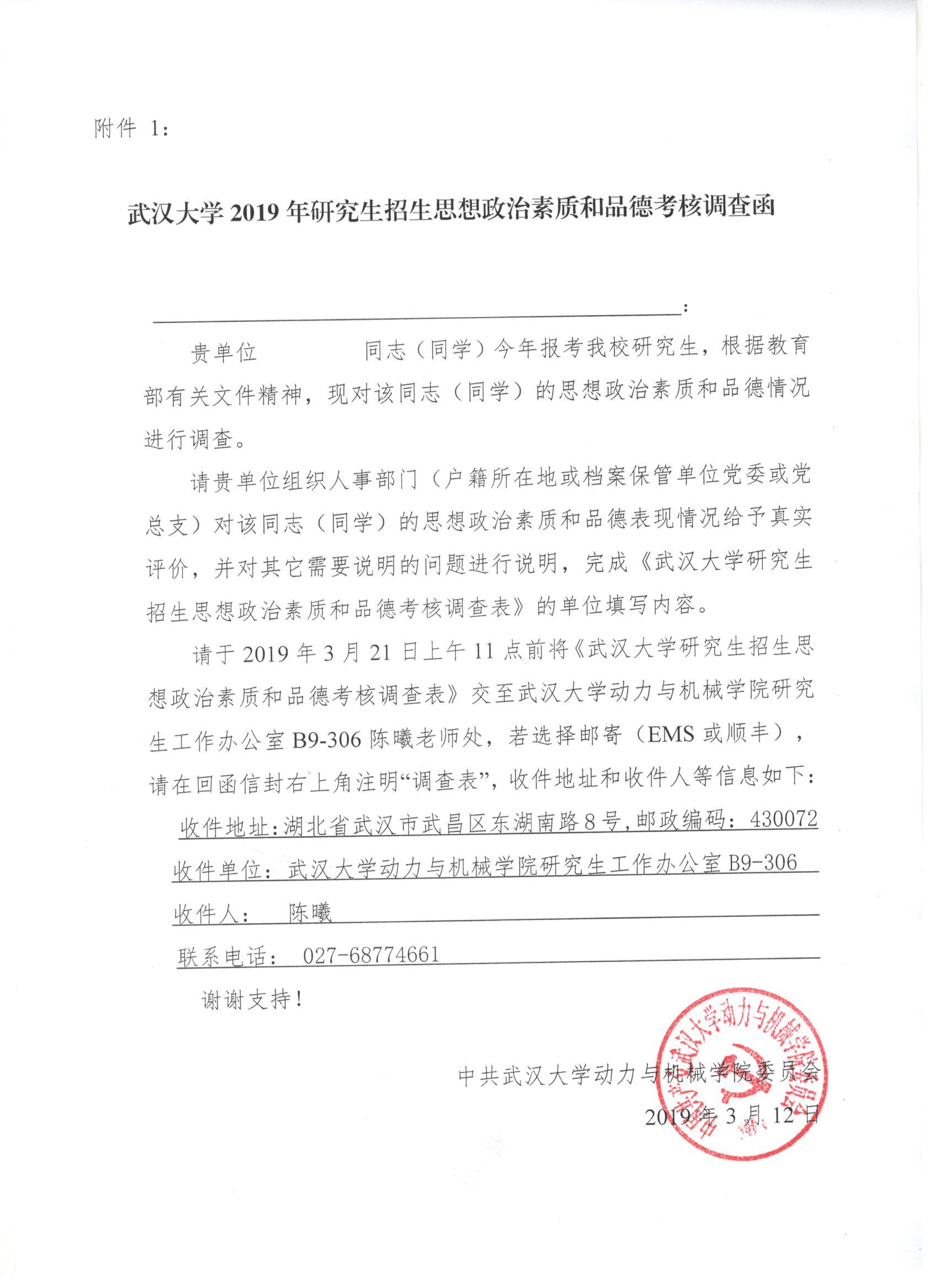 请考生及时下载《番号鸽 2019年研究生招生思想政治素质和品德考核调查函》(以下简称:调查函,见附件1)和《番号鸽 研究生招生思想政治素质和品德考核调查表》(以下简称:调查表,见附件2),其中调查函请彩打,调查函和调查表请认真手写填写完整自己的信息(调查函第一行写自己目前所在单位,第二行空白处写自己的姓名)后,将两个表格一并交给本单位相关负责人,请求其完成考生调查表中单位填写的部分,并于参加复试前(3月21号上午11点前),提交或邮寄调查表(注意:番号鸽 不需要调查函,因为调查函是让考生给帮你写调查表的老师看的)至番号鸽 学生工作办公室(B9306)陈曦老师处。