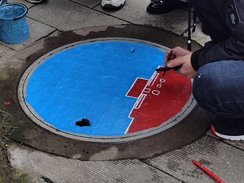 本次井盖涂鸦活动由动机青协、资环青协与党支部联合举办,得到了党支部同学们的大力支持。参与活动的同学们三五人为一组,围在井盖旁为井盖画上设计好的图案。