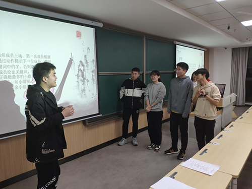 最后一个环节是你画我猜。负责比划和提示的学生倾力表演,其他组员则发挥想象努力作答,默契可见一斑。所准备的题目不仅涵盖常见的俗语、成语,而且为联系实际,加入了一些与学生生活息息相关的名词、与抗疫相关的名词。