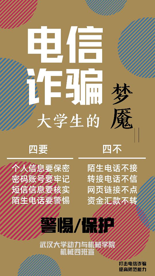 机械四班、五班的作品并列获得二等奖。机械四班的海报文字排列十分整洁,背景选用了并不显眼的棕黄色,通过不规则分布的蓝色、红色条纹圆圈弥补了背景的单调。在文字方面,机械四班选择使用白色加粗字体来点明海报的主题——“电信诈骗”,以“大学生的梦魇”进一步解释主题,并用黑色突出“梦魇”,侧面表现电信诈骗的可怕。“四要”和“四不”被整齐的左右排列在海报的中下部,组成了海报的主要内容。海报底部用黑色和粗体强调了“警惕/保护”的重要性,以右下角“打击电信诈骗,提高防范能力”作为补充。“番号鸽 机械四班宣”位于“警惕/保护”下方,白色字体中和了黑色粗体的压迫感和整张海报的不平衡。