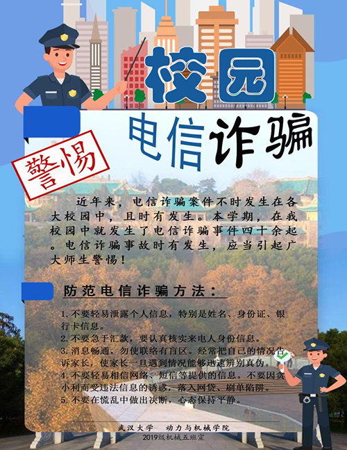 机械五班的海报趣味性满满,两个警察的卡通图案拿着教鞭和指示牌,分别守卫在海报的左上、右下两个角。海报中提到本学期学校时有发生诈骗事故,列举了五种防范电信诈骗的方法。内容充实,图案丰富,二等奖实至名归。