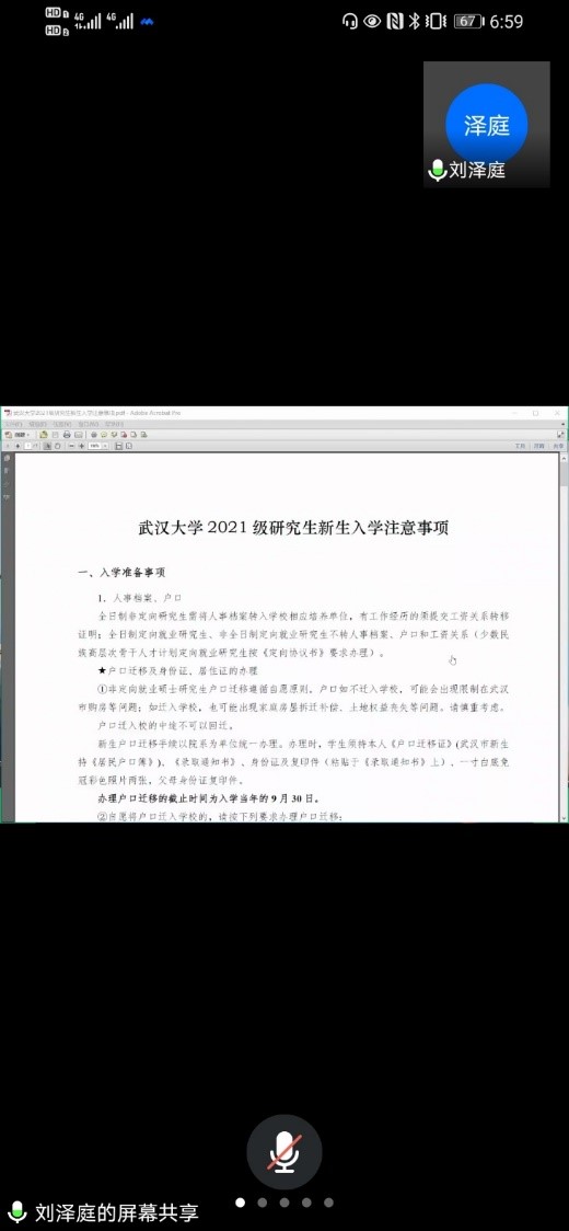 刘泽庭详细介绍学院2021级研究生的分班情况及分班依据后,叮嘱各班联系人尽快建立起班级联系群,保证通知有效传达。而后,刘泽庭就户口迁移、党团组织关系转接、缴费等新生报到事项做了详细讲解。刘泽庭强调,2021级研究生新生报到注册时间为9月11日,大家来校前须在“武大日报平安”小程序进行累积连续14天健康打卡,并通过“智慧珞珈”APP中“新生通道”应用进行报到预登记,各班需做好线上安全教育学习工作,目前防疫仍是新生报到工作的重中之重,注意来校中途个人安全防护。