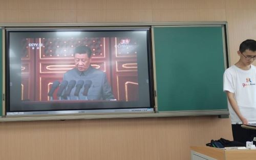 现场还播放了在庆祝中国共产党成立100周年大会上,天安门广场青少年献词团的献词视频。青年之声响彻天安门广场上空,也响彻同学们的心间。
