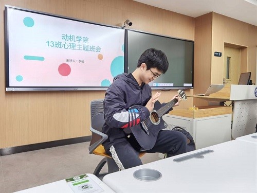 在班会的第一部分中,17班和13班两个班级使用了别具一格的方式来解释什么是“心理问题”:17班心理委员自德银用一段诙谐幽默的动漫片段紧贴实际地为同学们揭示了心理问题的内涵,而13班叶政麟则是用一曲吉他弹唱创设了轻松的氛围,将同学们引入班会情境之中。