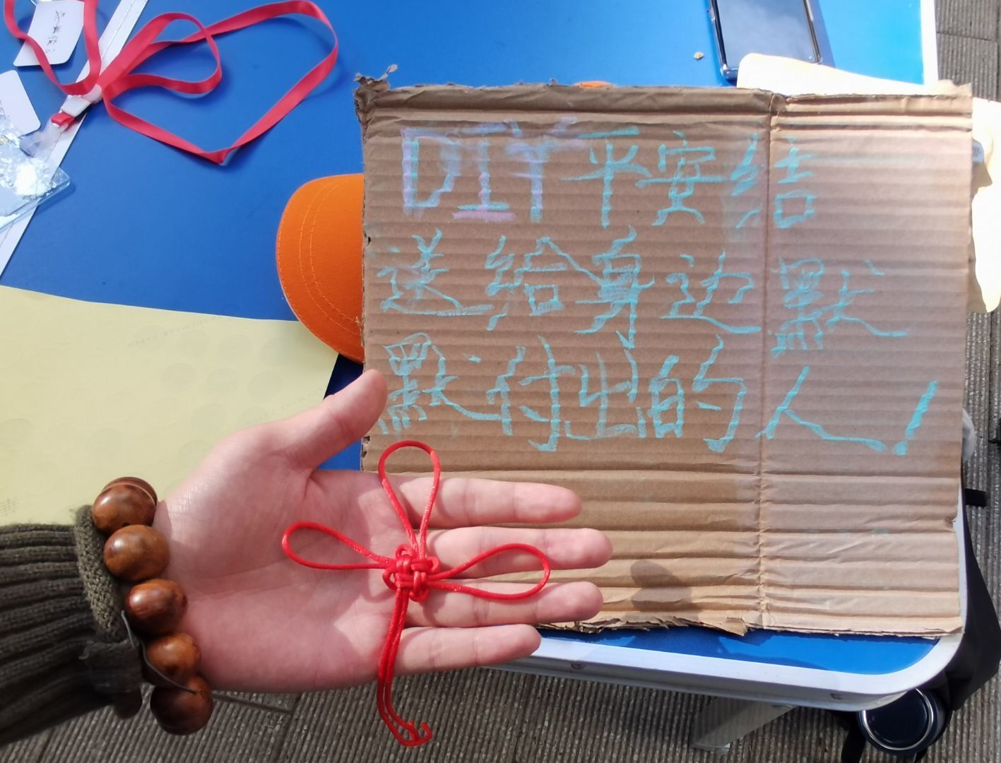 一个个平安结像是一个个美丽的花朵,在这寒冬中绽放。同学们对叔叔阿姨们的关爱之情也让这寒日温暖了起来。从总是做不好平安结的失落,到能独立结好的那一声惊呼,快乐的氛围逐渐感染了路人,都纷纷欲试。在同学们的努力下,一根根红绳变成了带着美好祝愿的平安结。我也有幸参与其中,虽然与标准略有不同,但其所蕴含的是满满的真情与祝福。