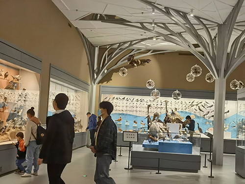 到达万林博物馆门前后,团支书陈艺婷先清点了人数,确保无一人落下,随后便带领团员们进入博物馆参观。首先参观的是自然展区,本展区展品种类丰富,包括鸟类、森林生物、水生物、极地生物。团员们漫步其中,每个人都被展品深深吸引,沉浸在自然的神秘与美丽之中。