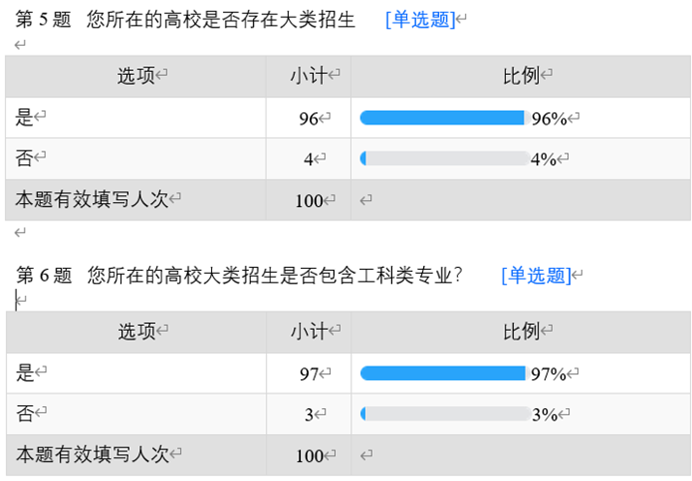 据100份线上问卷结果,所有目标高校均采用了“大类招生”模式。在这之中,多数高校的“大类招生”包含了工科专业。由此见得,“大类招生”的策略在42所高校中得到了普遍认可和采纳,这成为人才培养的重要环节之一。