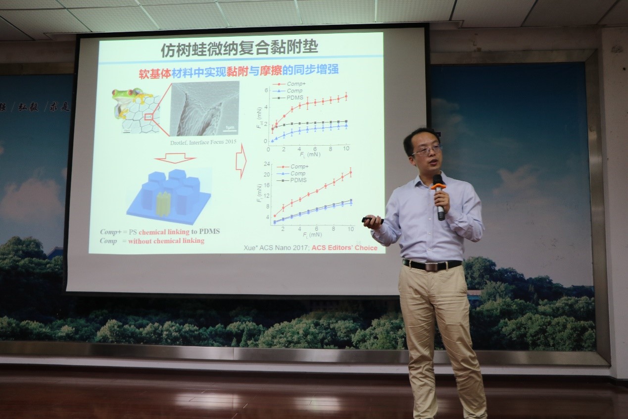 薛龙建列举自然界中的可逆黏附材料,着重讲解壁虎与树蛙的黏附力,并将二者进行对比。在这项研究中,他成功突破国外设计技术,将树蛙的平滑结构与壁虎的刚毛结构相结合,实现黏附力的不断提高;他提及曾在从一名德国植物学家处受到启发,决定向爬山虎学习,从而实现仿生黏附材料在粗糙表面的黏附;他以一种由壁虎和毛毛虫结合而产生的Geca-Robot设计为例,对其设计理念与思路做出讲解,并科普这些材料的广泛应用前景,引发同学的思考。他告诫同学们:“仿生学并非模仿生物,而是受生物启发,因此要多观察自然。”