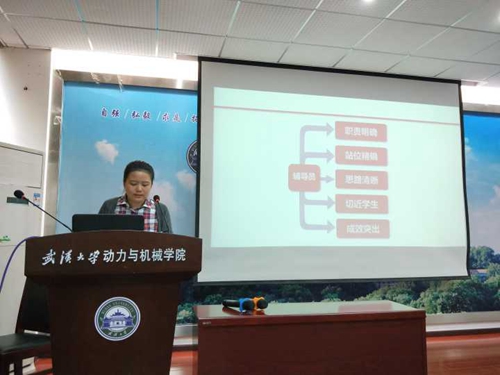 首先进行汇报的是16级辅导员谢林桥。谢老师从思想理论教育和价值引领、党团和班级建设、学风建设和学术科技实践、心理健康教育、学生日常事务管理、校园危机事件应对、职业规划与就业指导、网络思想政治教育、理论与实践研究等方面汇报了自己上学年的工作。他在这一年中,抓住教育契机,打造教育平台,加强思想理论教育和价值引领;抓好四个群体、落实三项会议;坚持集中教育与个别教育相结合的方式,积极动员并组织学生参加各类学术科技活动,营造浓厚学习氛围;全面了解,个别沟通,持续帮扶做好心理健康教育;实事求是,认真细致,全力做好学生事务性常规工作;熟悉预案,及时应对校园危机事件;因人施教、分类引导做好学生择业、职业规划教育;充分利用新媒体技术全面加强学生网络舆情监督,做好理论与实践研究。