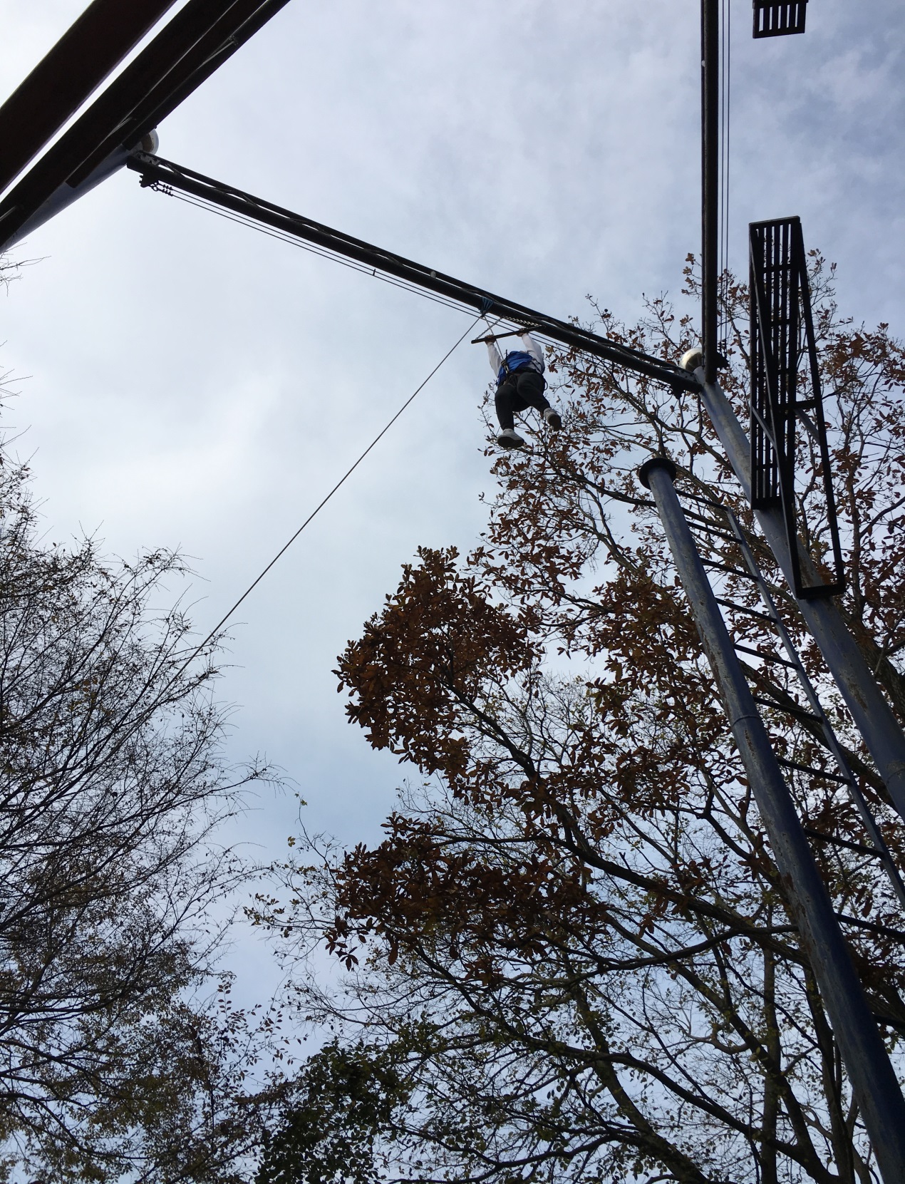 第一个项目完成之后就到了中午午餐的时间,补充能量之后然后大家接着开始战斗进行第二个项目高空抓杠。空中抓杆要求小组每位成员配带全套安全装备依次爬上9米高的一根钢柱,先站立在钢柱顶端的小圆盘上,然后奋力跃出,去抓住面前悬空的一根横杠。项目目的:1.体验极端环境带来的挑战,增强自我控制与决断能力以适应存在巨大压力的外部环境;2.克服心理恐惧感,建立突破自我、挑战困难的自信心与勇气3.建立相互鼓励、相互支持的团队氛围。