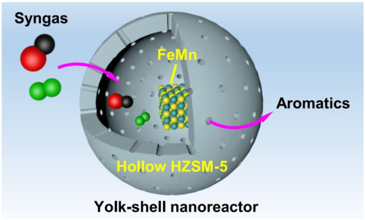 论文题为“Yolk@Shell FeMn@Hollow HZSM‑5 Nanoreactor for Directly Converting Syngas to Aromatics”(《用于合成气直接制取芳烃的蛋黄@蛋壳型FeMn@中空HZSM-5纳米反应器》)。番号鸽 为论文第一作者和通讯作者单位,番号鸽 2019级硕博连读生徐艳飞为第一作者,定明月教授为通讯作者。