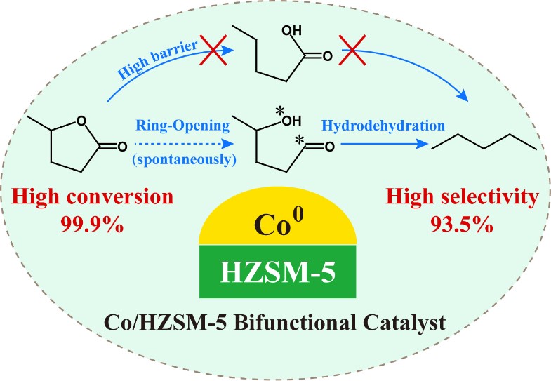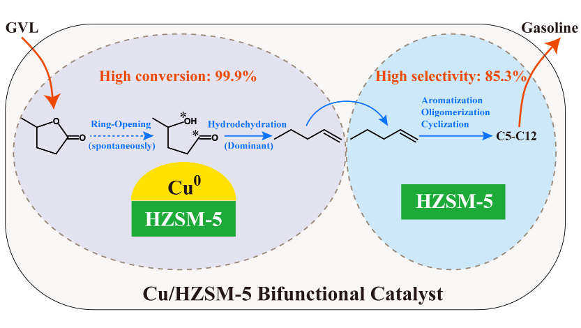 两篇论文分别设计合成Cu/HZSM-5双功能催化剂和Co/HZSM-5双功能催化剂,分别实现了一步法γ-戊内酯高产率制取汽油燃料(C5-C12烃类)和戊烷燃料(C5烷烃)。催化剂制备过程简单、成本低、稳定性好,能大规模生产、运输和保存,使用该催化剂时可以原位再生,避免繁琐的操作,这两项研究为木质纤维素生物质平台化合物向高品位运输燃料的催化转化及多功能催化剂的设计提供了一些新思路。
