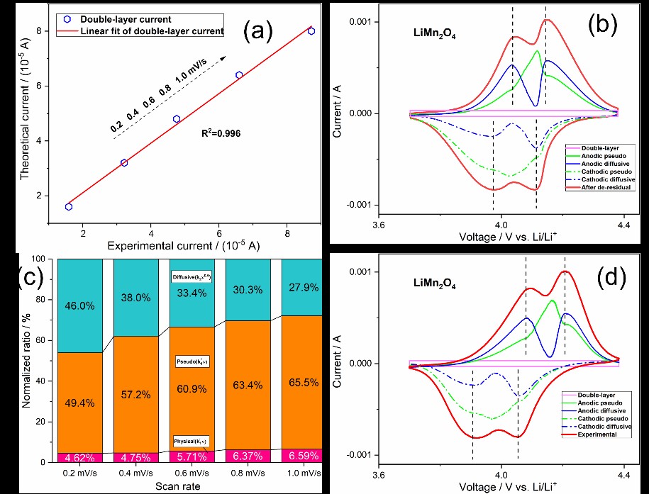 然而,该方法在应用时存在诸多模糊不清甚至误解之处,主要原因包括:(1)未考虑欧姆极化引起的过电位对电压偏移的影响;(2)未修正扫描方向反转时的残余电流;这两个原因经常导致拟合曲线与实验曲线中的氧化还原峰存在偏差,甚至出现拟合值超出实验值的假象;(3)双电层电容电流未从赝电容电流中分离出,导致计算所得的赝电容偏大。事实上,式1中的电容电流