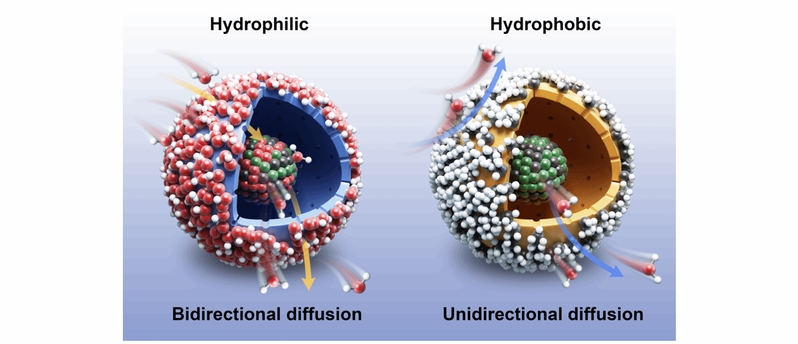 相较于“Co基FTS-分子筛”,“Fe基FTS-分子筛”催化体系可以生成较多高辛烷值的芳烃、烯烃、环烷烃和异构烷烃,更接近于实际的汽油组分。然而,“Fe基FTS-分子筛”在反应中会产生大量的副产物CO2,其在所有产物中的选择性通常高达40%左右。在前期的研究工作中[Science 2021, 371, 610-613; Chem 2021, 7, 1977-1980],定明月教授团队发展了疏水界面调控与水相关副反应的思路,显著抑制了Fe基FTS催化剂上副产物CO2的生成。疏水改性是一种调节FTS催化剂性能的有效策略,并且不同的疏水化方式对合成气转化反应有着不同的调控作用[Science 2022, 377, 369-370],然而造成这种区别的根源尚不清楚。因此,有必要深入研究亲/疏水催化剂上水分子的扩散行为及其对合成气转化反应的影响机制,特别是对于“Fe基FTS-分子筛”双功能催化体系。