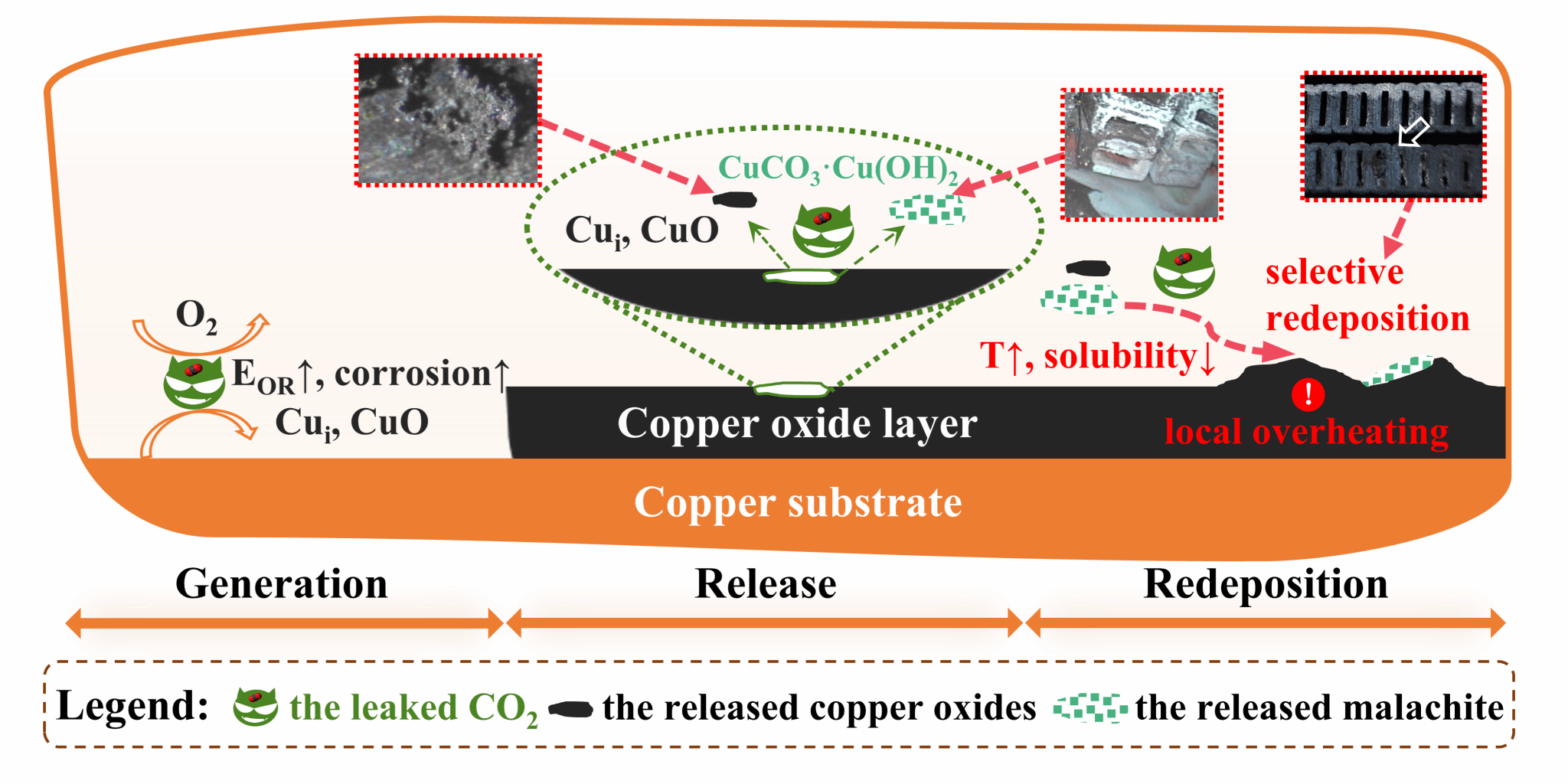 该文基于Cu-O2-CO2-H2O多元体系的化学热力学分析,建立了内冷水氧还原电位、不同温度条件下铜腐蚀产物溶解度与CO2渗入量的定量关系,提出了CO2渗入引发“铜腐蚀速率加快-铜氧化层失效脱落-脱落氧化物高温区选择性沉积”等连串反应的作用机理(图1),并通过对某核电站进口发电机因腐蚀堵塞报废机组空芯铜导线的全面检测得到了证实。为此,通过理论与实践相结合,首次揭示了CO2渗入导致铜导线腐蚀-堵塞的机理。