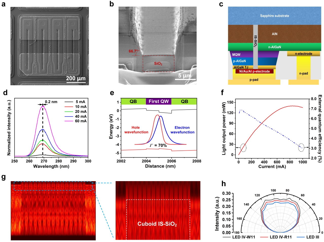 为了解决上述问题,周圣军课题组在深紫外LED结构中引入阶梯形量子阱和SiO2插入层结构。通过引入阶梯形量子阱结构能够抑制AlGaN基深紫外LED有源区中的量子限制斯塔克效应,增加电子和空穴波函数的重叠积分,提高载流子的辐射复合效率。利用AlGaN与SiO2材料的折射率差异使沿横向传播的TM偏振光在SiO2插入层的内表面发生反射和折射,最终从蓝宝石衬底出射到空气中,从而提升深紫外LED芯片的光提取效率。这种融合了能带工程和器件工艺的设计思路使得AlGaN基深紫外LED的外量子效率提升了4.5倍,为开发用于生物医学测试、空气和水净化以及杀菌消毒的大功率深紫外光源提供了理论指导和技术支撑。