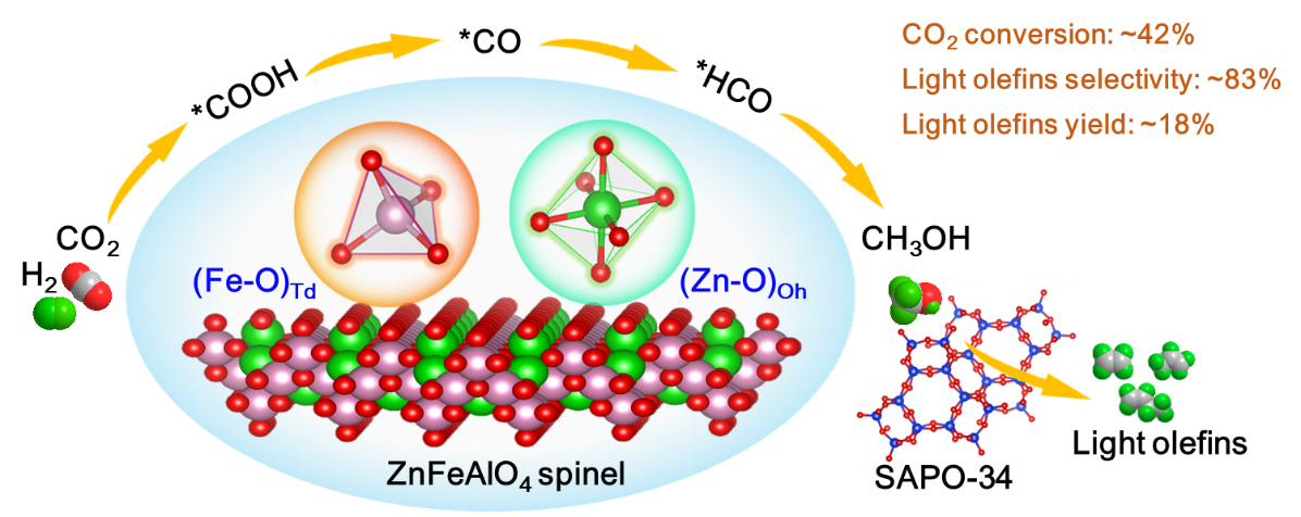 基于吸热的逆水煤气反应(RWGS)具有高温促进CO2转化以及将惰性CO2转化为较活泼CO的优势,设计出CO2先经RWGS反应生成CO,随后CO加氢生成CH3OH并进一步生成低碳烯烃的新反应路线以及构建高效的多活性位点,有望解决CO2分子难活化、C-C键增长难控以及C=C键易加氢等难点,最终打破“跷跷板”效应。