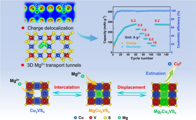 目前镁电池发展的主要难点在于正极材料的开发,镁离子(0.72Å)与锂离子(0.76Å)半径相当,但带有两个单位正电荷,与正极材料作用力强,常见的正极材料储镁容量较低且动力学性能较差。针对此问题,徐飞副教授课题组设计开发了一种四硫代钒酸铜(Cu3VS4)正极。V和S原子形成高共价键比例的化学键,促进电子通过V‒S键离域,减少了与二价镁离子的相互作用,诱导了V和S的共氧化还原。Cu3VS4的晶体结构具有交错的3D隧道,有利于固态镁离子传输。Cu3VS4具有高容量、高倍率、优异的循环稳定性,且在高活性物质负载情况下仍能实现高倍率性能。该工作近日发表在美国化学会期刊ACS Nano上(ACS Nano, 2024, 18, 28810−28821)。
